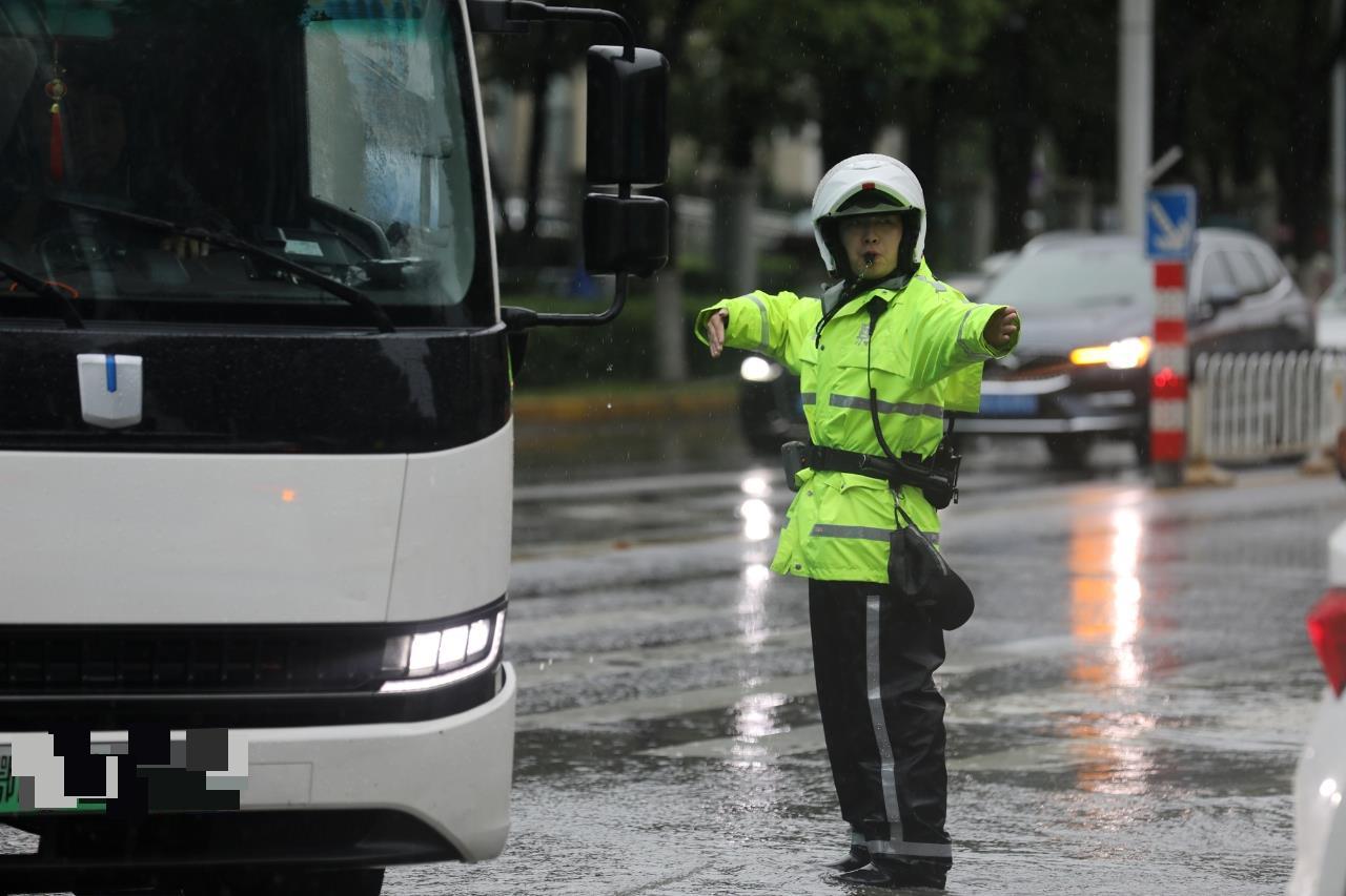 清晨,江夏区交通大队藏龙岛中队民警蒋仲超便带领辅警驻守光谷大道湖东路路口。暴雨如注,他们全身湿透,却始终专注地指挥交通,引导车辆交替通行,有效缓解了积水路段的交通拥堵。同一时间,武汉软件工程职业学院门前,执勤民警身披雨衣,有条不紊地指挥接送学生的车辆即停即走,确保学校周边安全有序。