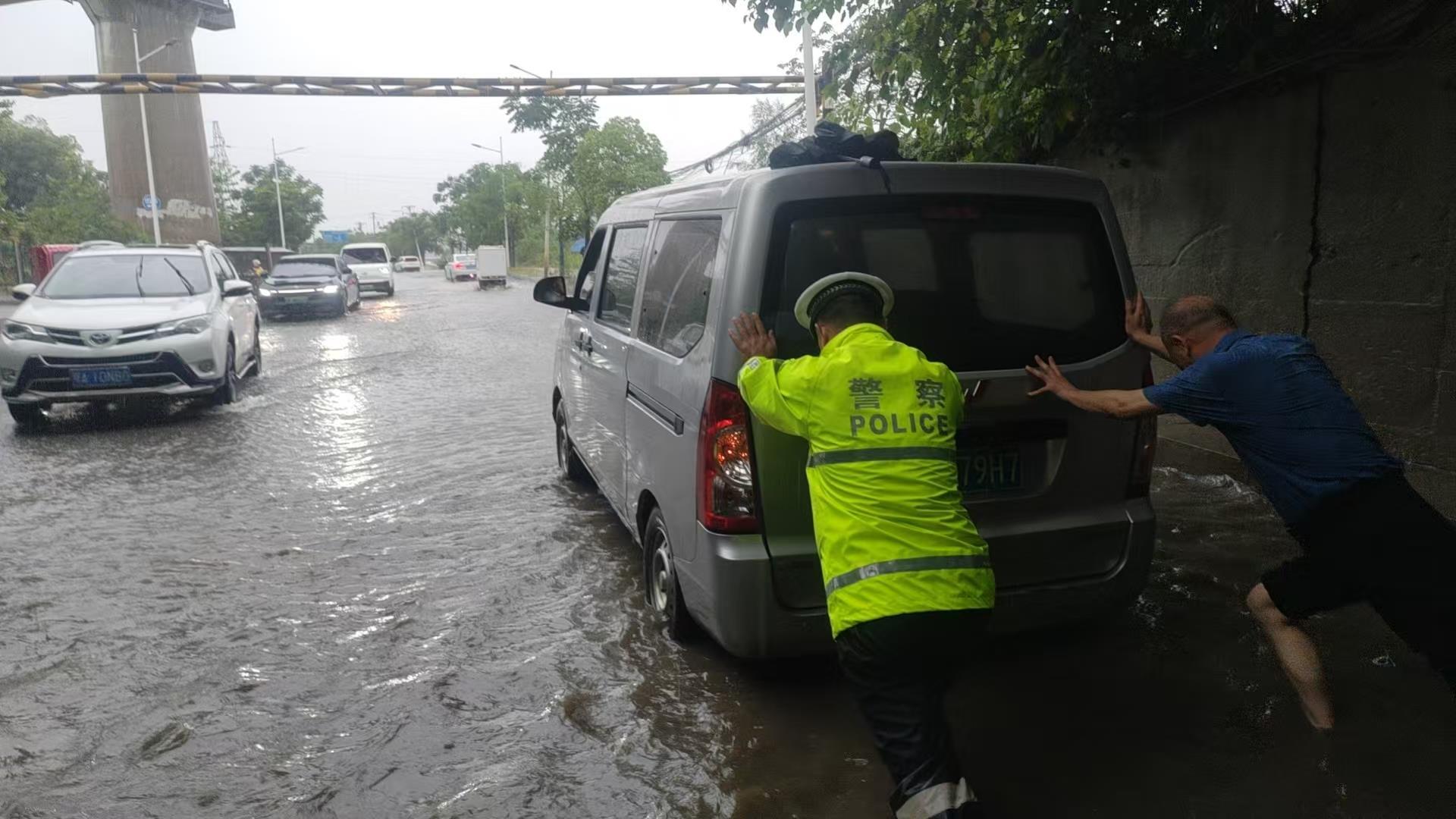 从5月21日晚至22日下午,暴雨突袭江城武汉。22日下午,一辆面包车在经过积水路段时不慎熄火,司乘人员正不知所措时,在附近巡逻的江夏区交通管理大队二中队辅警王洪及时赶到,他不顾积水浸湿鞋袜,立即联合车内人员合力将被困车辆推至路边安全区域,及时消除了安全隐患。