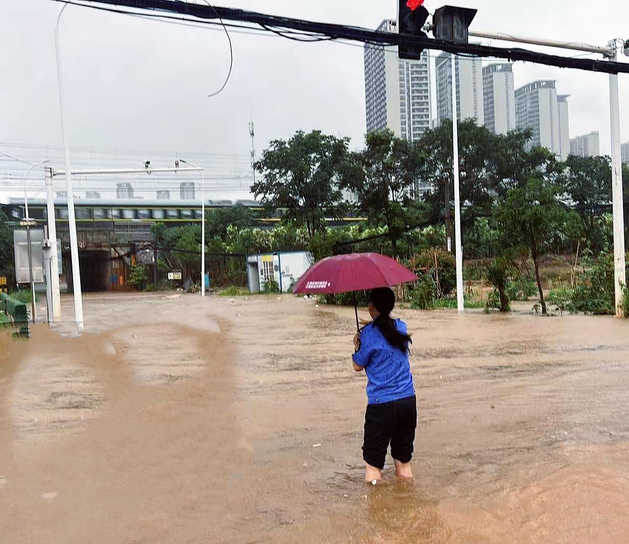 5月22日,暴雨过后30分钟内,江夏城管应急小组全员集结完毕。执法队员在齐膝深的积水中化身“人体路标”,现场指引过往车辆及行人通行。