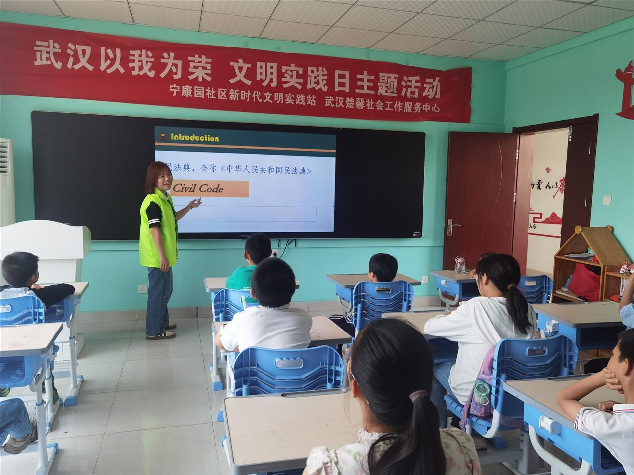 5月23日,武汉经开区沌口街道宁康园社区新时代文明实践站联合江汉大学外国语学院,开展“法典映童梦 语绘新天地”主题教育活动,通过“双语普法+创意手绘”的沉浸式体验,为辖区青少年带来一堂生动的法治文化教育课。