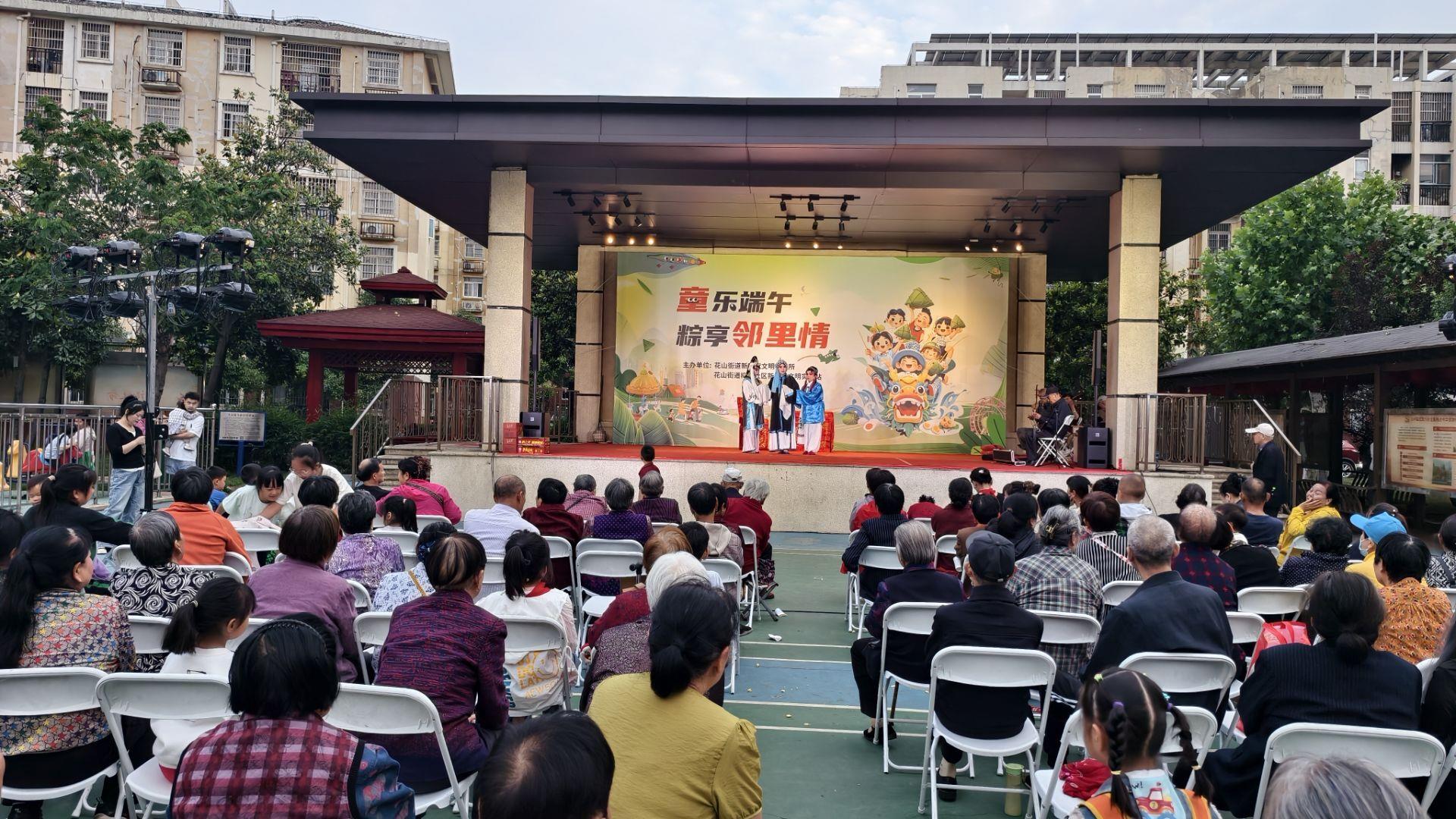 傍晚时分,戏曲表演在激昂的锣鼓声中拉开帷幕。社区戏曲爱好者率先登场,演员们身着精美服装,以细腻的唱腔和传神的表演,将端午时节的民俗风情与动人故事娓娓道来。台下观众或凝神屏息,或频频点头,不少老者轻摇折扇,跟随节奏轻轻哼唱,沉浸在传统戏曲的独特韵味之中。