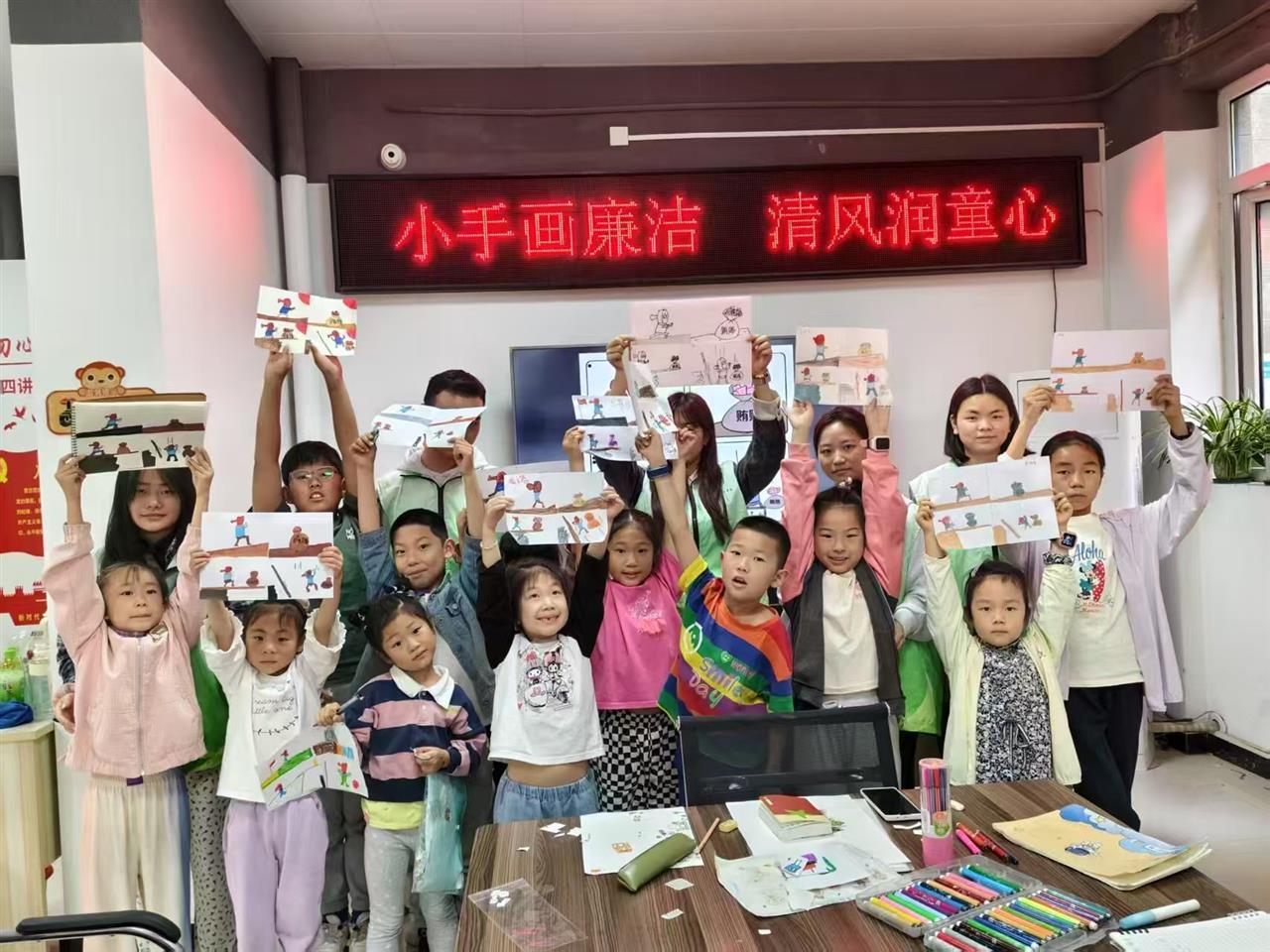 除了学业课程,“爱心学堂”还开设了一系列兴趣拓展课程,如绘画、手工制作等。在绘画课上,孩子们以“廉洁文化”为主题,用七彩画笔勾勒出心中的清风图景,让廉洁理念在艺术创作中悄然浸润心灵;手工制作课上,孩子们用一双双小手把“废品”变“宝物”,创造出了一件件精美的手工作品。这些课程不仅丰富了孩子们的课余生活,还激发了他们的创造力和想象力。