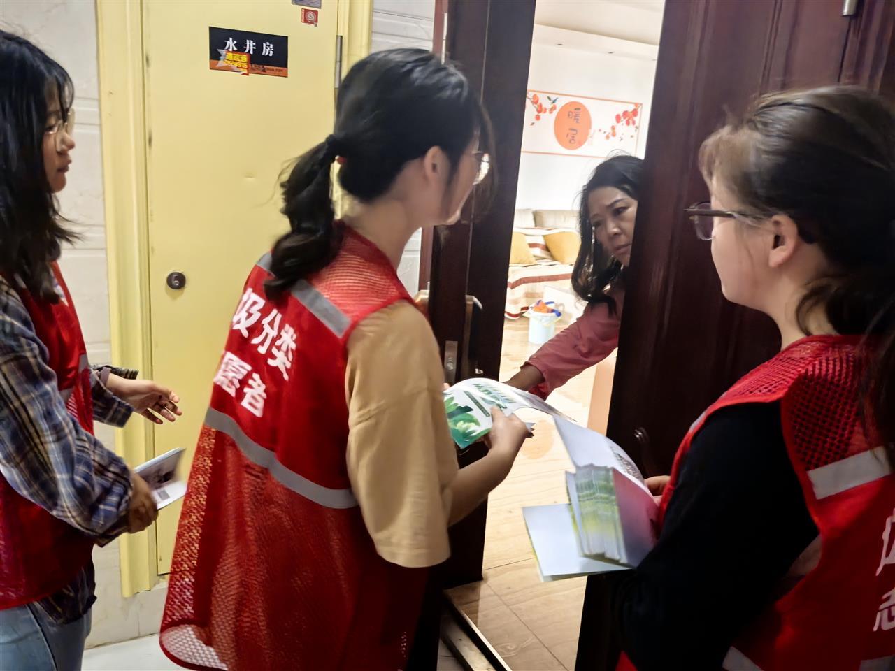 活动现场,高校志愿服务队、小区党员和垃圾分类志愿者们组成“环保宣传小分队”,深入小区居民家中开展入户宣传“敲门行动”,将垃圾分类知识送到居民家中。