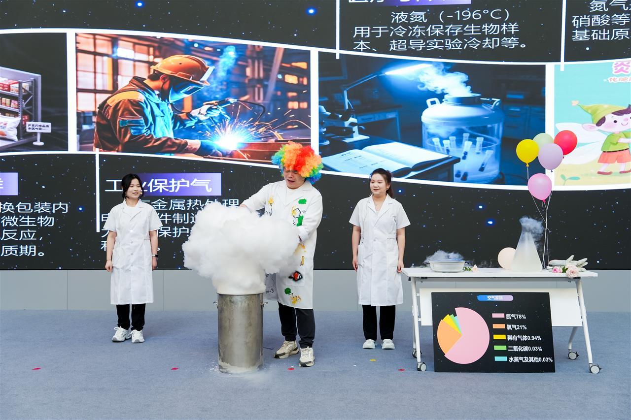 启动仪式上,来自武汉科技馆的科普团队现场进行《拱形的奥秘》科学实验展演,用项链垂坠实验揭秘千年木拱廊桥的承重原理;中山路小学的学生以中国核潜艇之父黄旭华院士的科研故事为蓝本,用游标卡尺实测、分段拼装等情景剧细节,生动演绎黄院士的“深潜精神”,让《深蓝的誓言》响彻云霄;武汉城市职业学院科技志愿服务队则带来科学表演秀《空气家族》,氦气变声、“液氮风暴”实验秀等互动让空气动力学原理妙趣横生。