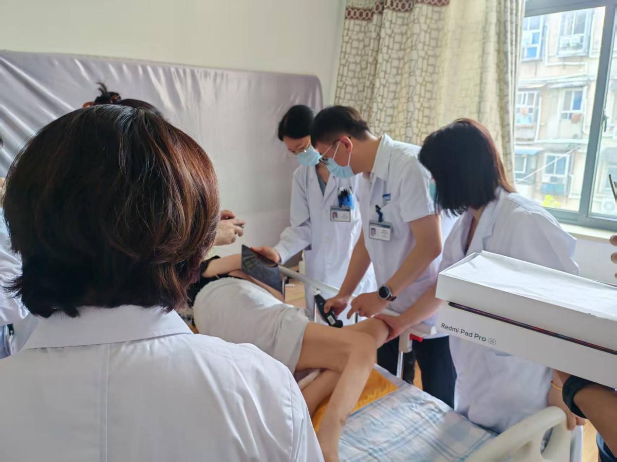 在万学东家中,医疗团队有条不紊地开展腹部、腿部超声检查。“别看这台设备小巧玲珑,却有着大作用。” 雷炳松主任一边操作设备,一边介绍道,“它轻巧便捷,便于携带上门,而且支持实时传输影像数据至总院,能够快速实现专家远程会诊,为患者的精准诊断提供坚实保障。”