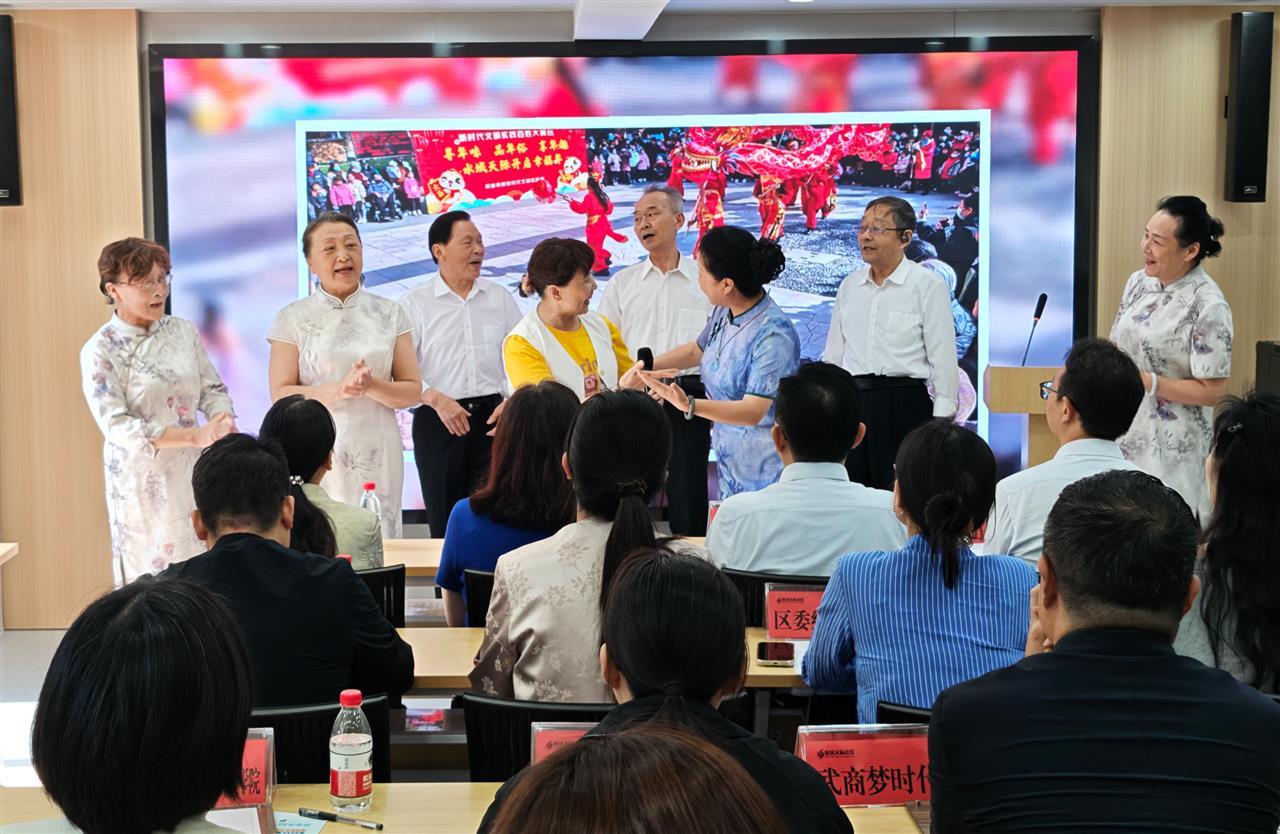 开放日活动现场,各功能空间同步开展丰富多彩的互动体验。“青跃空间”内,南湖街道老年大学学员带来的原创节目《三句半——水域天际一家亲》赢得阵阵喝彩,展现了传统文化在社区的蓬勃生机;“青心驿站”里,专业心理咨询师带领居民开展解压活动,通过趣味互动传递人文关怀;“青创书苑”中,手工艺制作与书画联创吸引众多居民驻足参与。二楼的“青邻课堂”更是将活动推向高潮,水域天际小区第二党支部书记刘胜辉带来《夯实基层基础工作,维护社会和谐稳定》主题宣讲,武昌区人大代表、南湖街道老年大学校长李雨嘉和社区诗篇艺术团献上原创歌曲表演《居民都是藤上的花》,政、企、校、媒、社等代表获“社区治理合伙人”授牌,彰显共建共治的青春力量。
