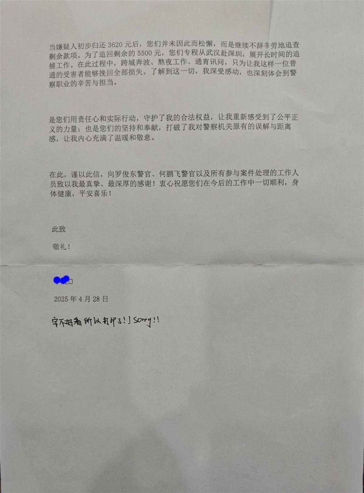 得知案件告破,李女士非常感动,向民意所寄来感谢信。5月中旬,李女士专程到民意所给办案民警送去锦旗致谢。