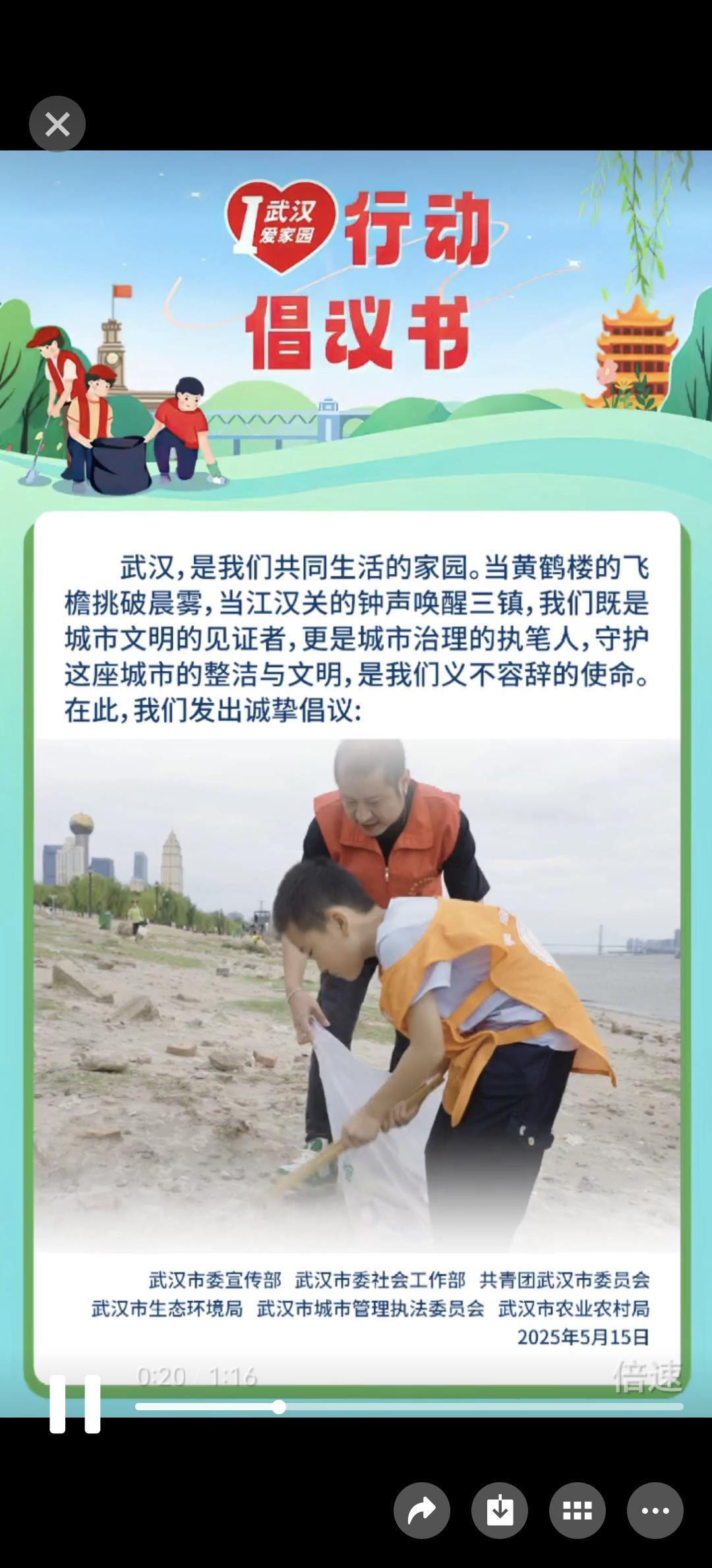 倡议清洁家园,始于你我。美好环境,共同缔造!让我们从清洁家园开始,以行动践行承诺,用热情汇聚力量,让长江之畔的武汉天更蓝、水更清、街更净、城更美!