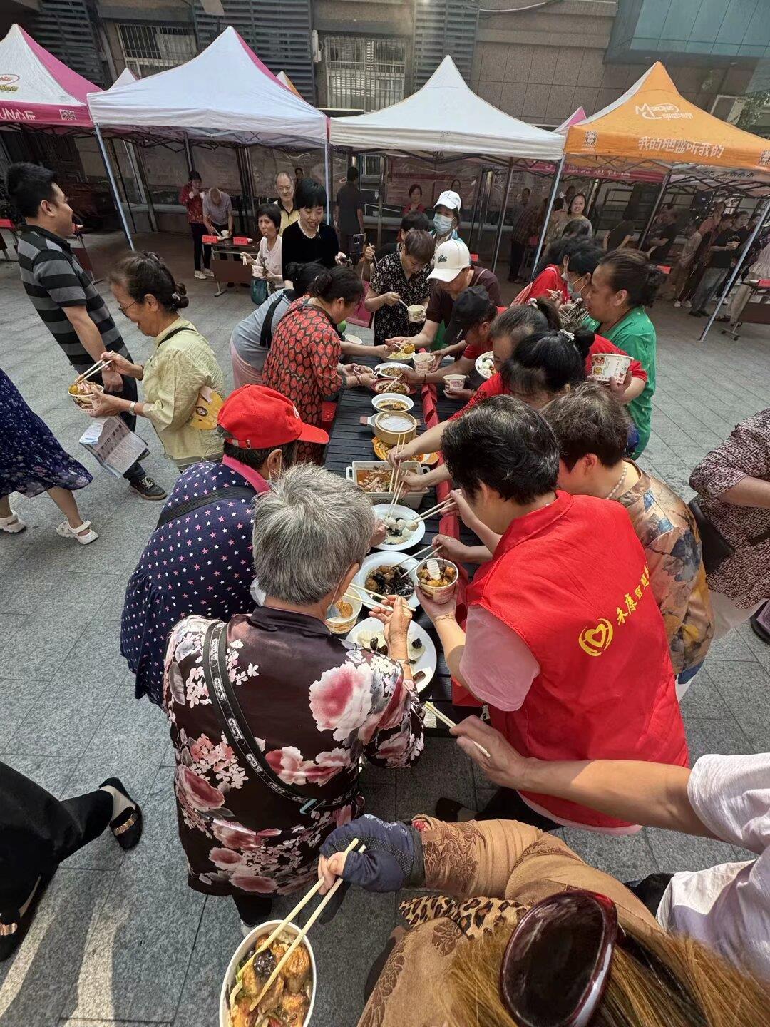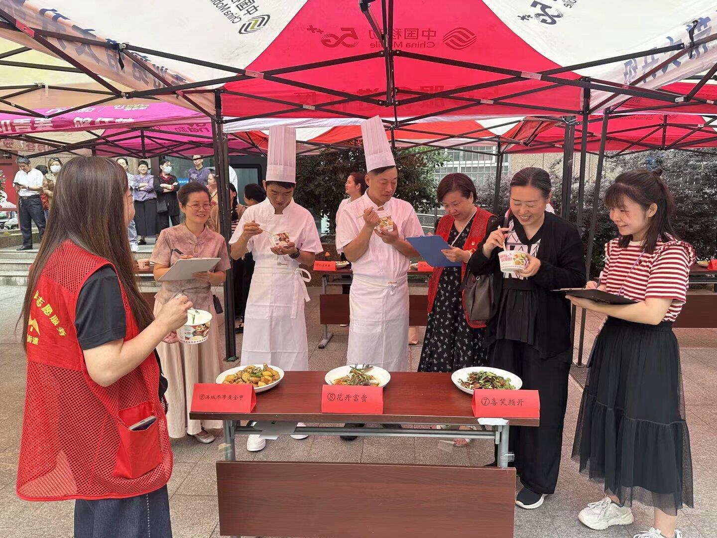 活动现场最引人注目的当属“百家宴”展区。60道由居民亲手烹制的菜肴整齐陈列,每道菜均配有创意名称和制作故事——“富贵吉祥”“孔雀开屏”“鸿运当头”等菜品不仅色香诱人,更承载着美好祝福与邻里心意。社区好味到食堂同步推出低盐低脂养生菜,吸引居民驻足品尝。由专业厨师和社区主厨组成的评审团,从色、香、味多维度评出一等奖5名、二等奖10名、三等奖45名,获奖者王阿姨表示:“名次不重要,能和邻居们分享手艺才是最大的快乐!”