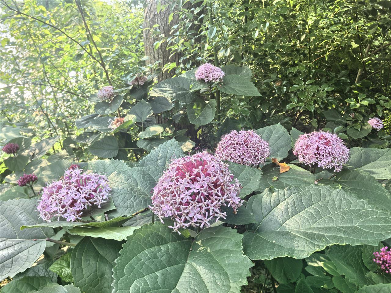 臭牡丹,虽名字中带“臭”,却有着独特魅力。其花型别致,球状的花序由无数小花簇拥而成,花色呈现出柔和的粉紫色,远远望去,宛如精致的绣球点缀在绿叶间。凑近观赏,每朵小花都舒展着花瓣,细腻而精巧。