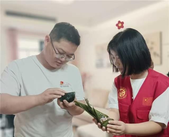 当天,党员志愿者一行捧着新鲜粽叶和五彩丝线来到独居老人郭铨家中,为老人表演歌舞,送上带着美好祝愿的“小红花”。郭奶奶翻开泛黄的相册,讲述了曾经和工友们在机械厂挥洒汗水的奋斗岁月,想起过端午包粽子的美好时光,还向大家示范捆扎“三角粽”的技巧。现场氛围十分融洽,大家一边包粽子,一边聊家常,感受着节日的温馨和欢乐。
