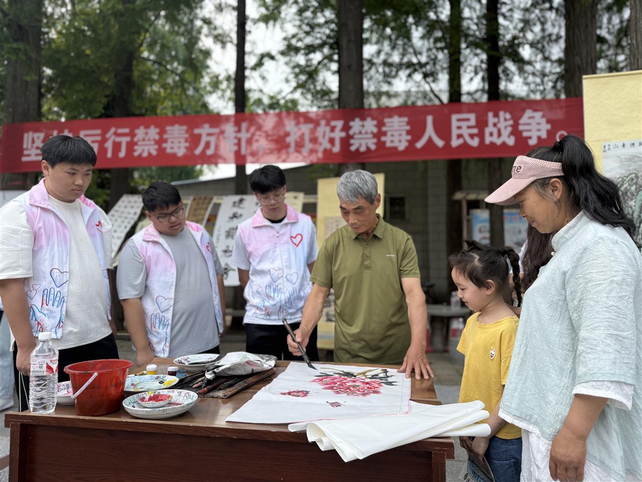 活动现场,市书画协会老师、老年学校书画班学员、武汉文理学院学生齐聚一堂,他们精心构思、笔走龙蛇,在水墨流转间勾勒出一幅幅主题鲜明的禁毒画卷。值得一提的是,就连幼儿园的小朋友们也积极参与其中,用临摹的方式创作禁毒作品,这些带着童真温度的画作,为这场禁毒艺术盛宴增添了一抹纯真而坚定的守护力量。