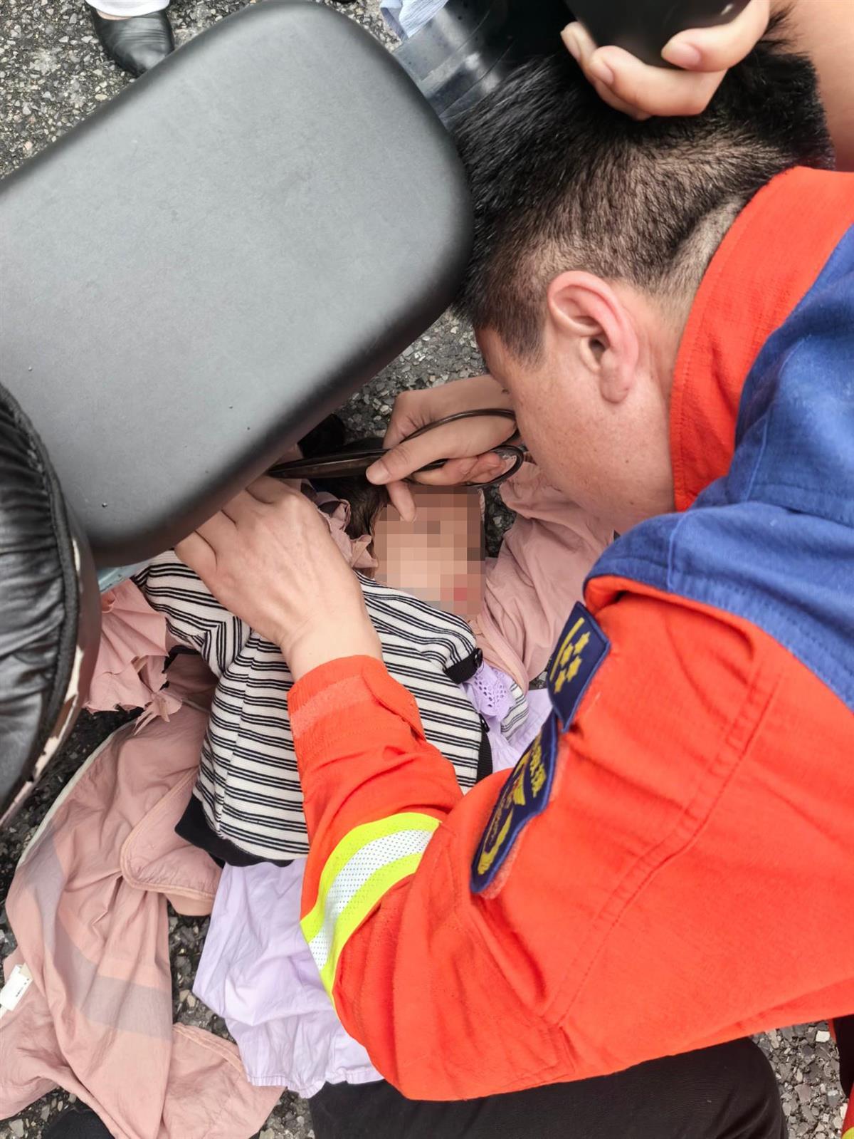 5月23日8时16分,在武汉市新洲区邾城街永安大道与南安街路口交会处,永安大道消防救援站的消防员在执行任务途中,发现一辆电动自行车倒在马路边,一名女童躺在地上,表情痛苦,其右手手掌随着防晒衣卷入后轮缝隙中。消防员找路人借来剪刀,将女童手部的衣物小心翼翼地剪开,女童的手掌最终顺利脱困。在确认女童的手并无大碍后,消防员撤离了现场。