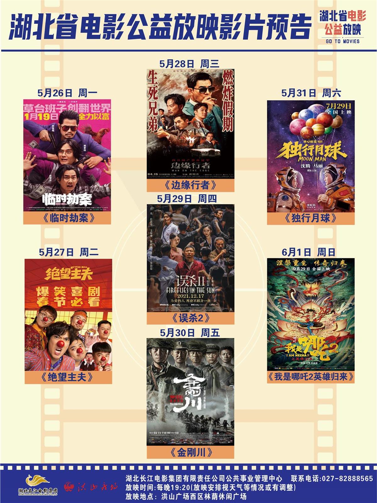 5月24日至5月31日晚7:00分别放映如下影片:《新大头儿子和小头爸爸5》《东北警察故事2》《临时劫案》《绝望主夫》《边缘行者》《误杀2》《金刚川》《独行月球》,6月1日特别放映《我是哪吒2之英雄归来》,欢迎小朋友到洪山广场来观赏,让六一充满欢声笑语,共度快乐节日!