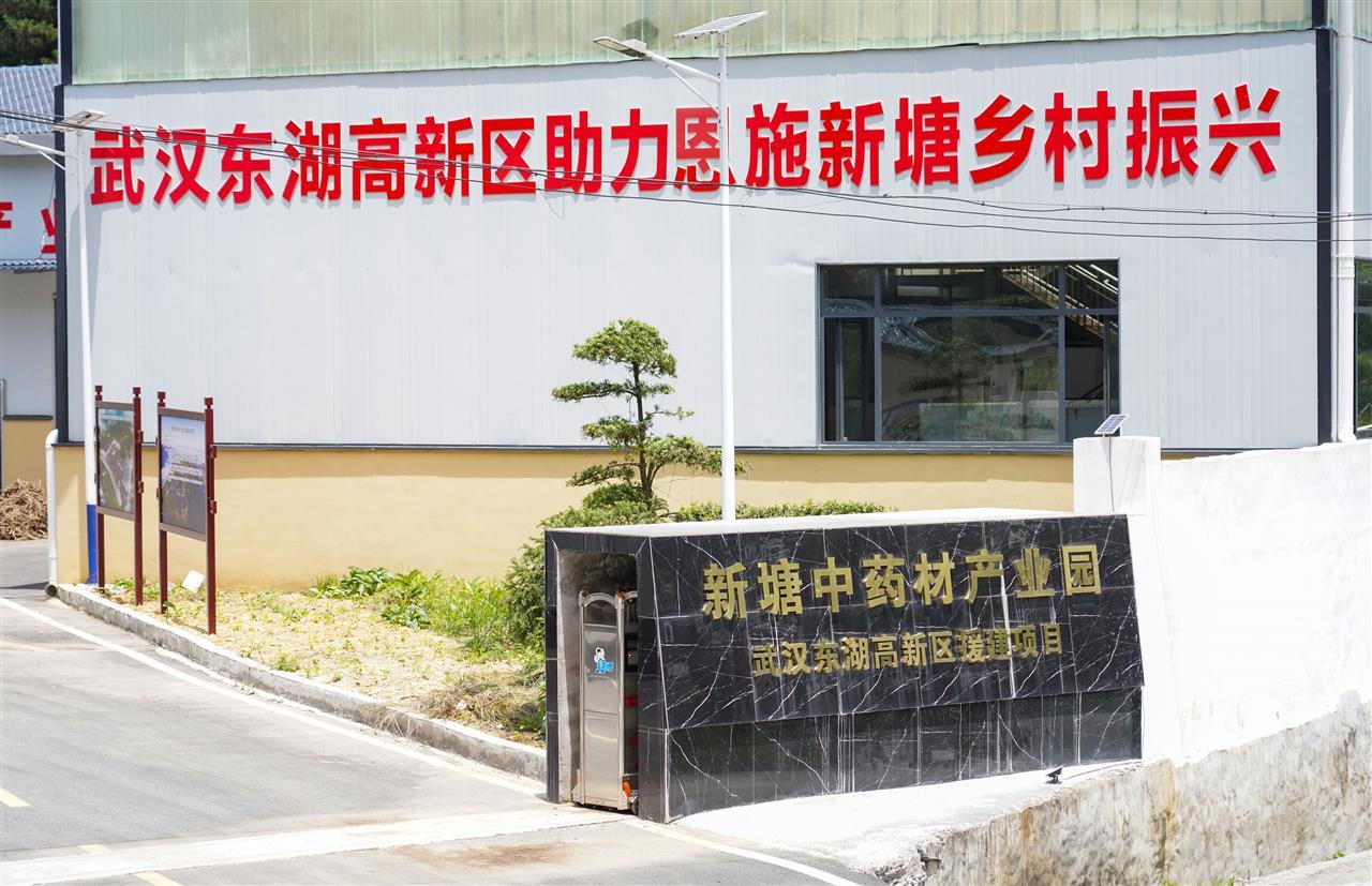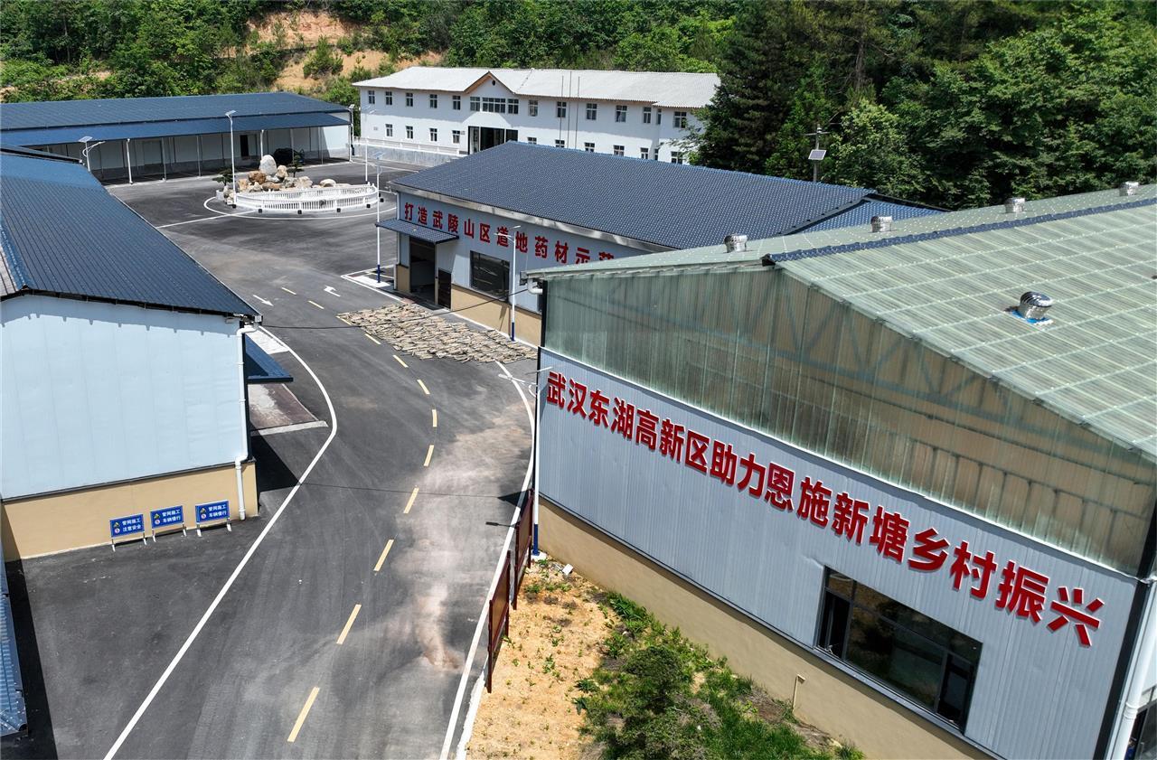 “东湖高新区助力恩施新塘乡村振兴”“打造武陵山区道地药材示范产业园”,位于恩施市新塘乡下坝村的光谷援建项目新塘中药材产业园内,两条红色的标语格外醒目。