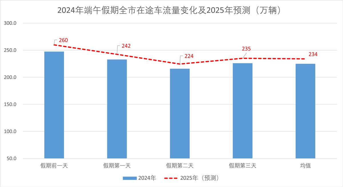 综合天气情况及假日出行特点,预计端午假期,前往商圈、旅游景区、城市郊区和网红景点等区域的车流将较为集中。端午假期前一天(周五)全市在途车流量预计将达到260万辆以上,假期期间预计日均车流量为234万辆,比去年同期上升4%左右,城市环线、高架、快速路的交通拥堵预计较为明显。30日(周五)为节前最后一个工作日,预计周五晚高峰将提前至16时开始,持续至21时结束。