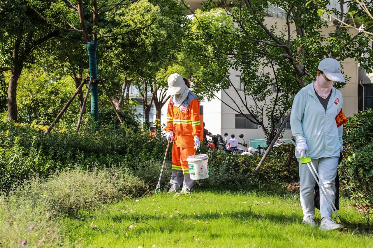 志愿者与环卫工一起保洁
