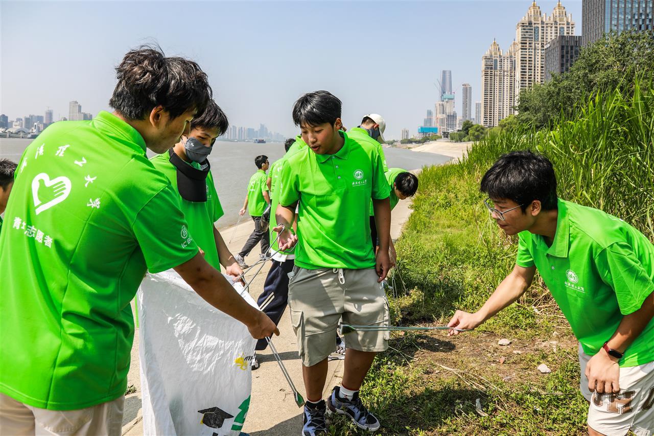 大学生在武昌江滩捡拾垃圾