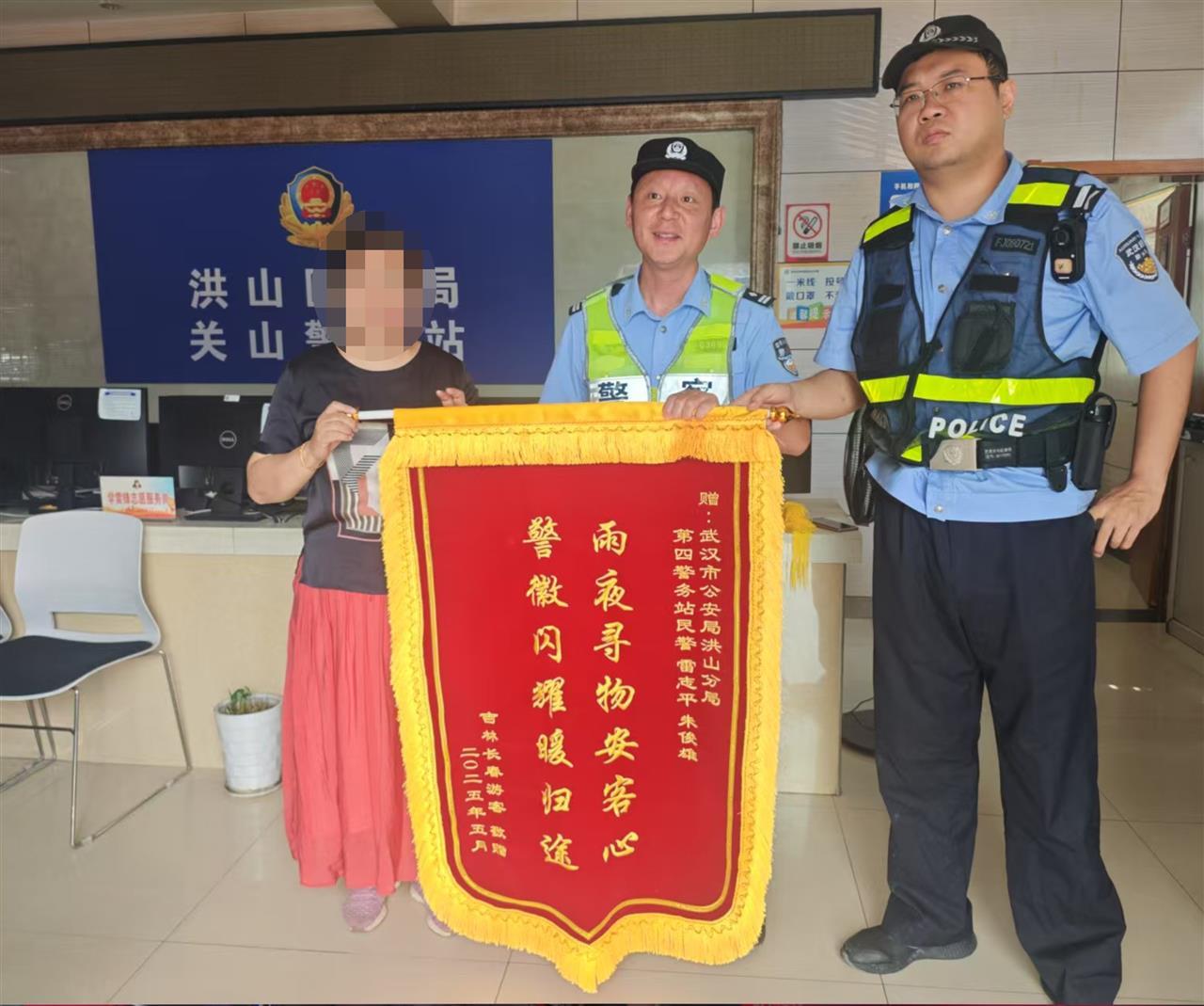 “离开武汉前,这面锦旗一定要送到!”来自吉林长春的游客王女士在踏上返程前,特意绕道前往武汉市公安局洪山区分局第四综合警务站,将一面印着“雨夜寻物安客心、警徽闪耀暖归途”的锦旗郑重地送到民警雷志平、辅警朱俊雄手中,以表达对二人冒雨帮其寻回手机的深切感激。