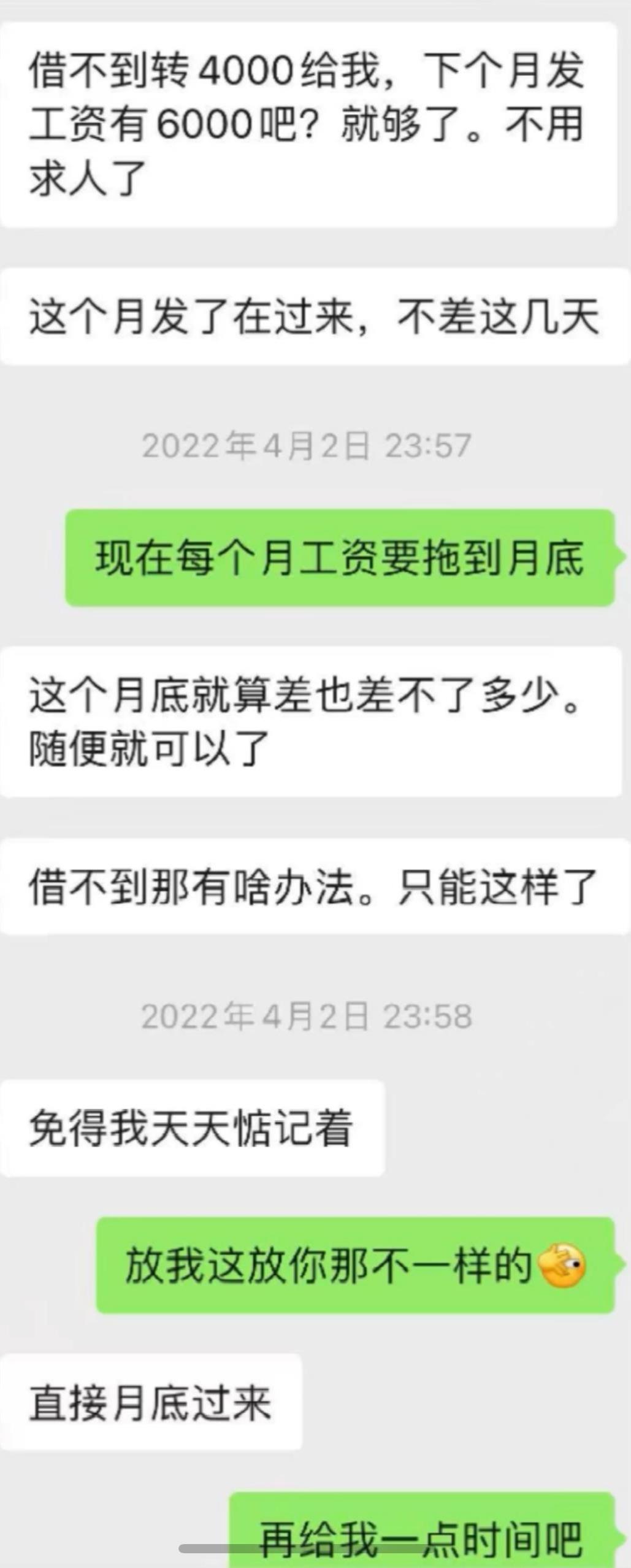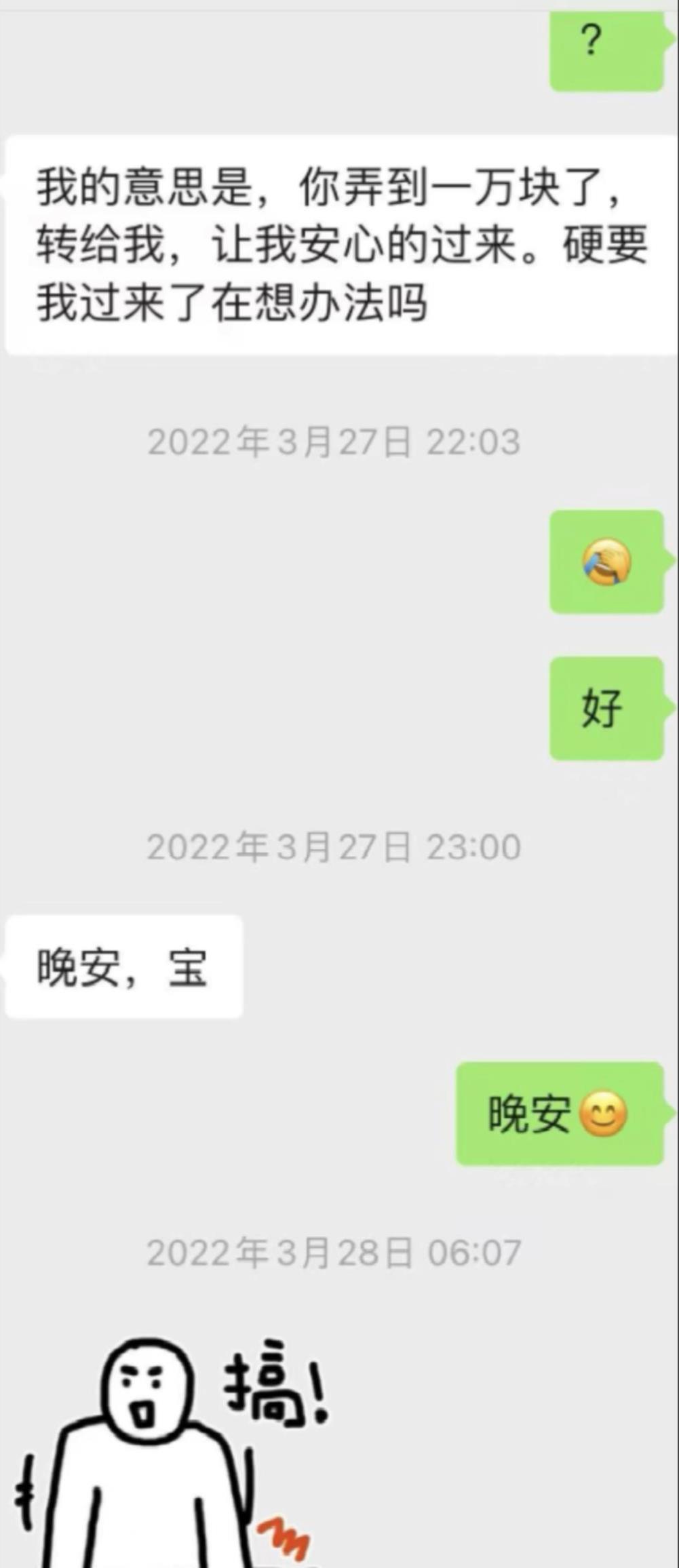 在两人成为恋人后,日常聊天时,小马总是有意无意地透露自己经济上的不宽裕,从信用卡还款、贷款压力,到渴望去看偶像演唱会却囊中羞涩,再到想买新衣服、新电脑……面对这些求助,已经被爱情冲昏了头脑的小武,想都没想直接向其转账。