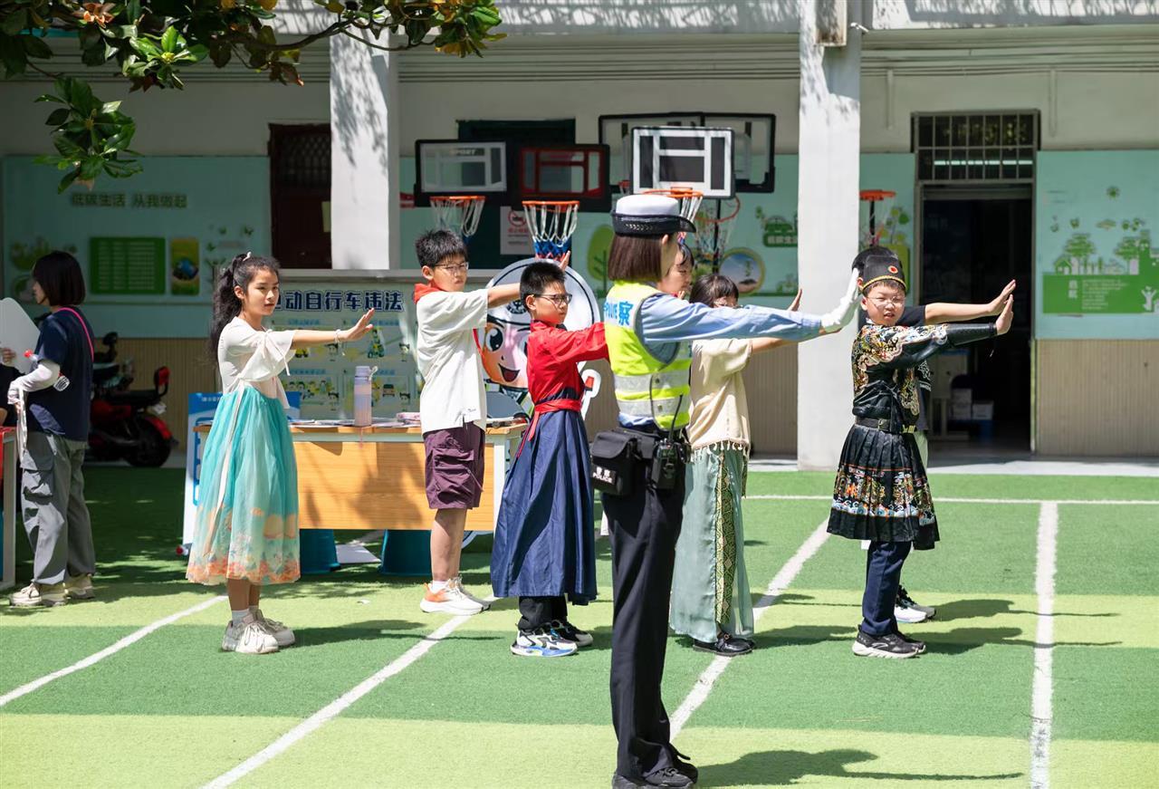 问答环节结束后,方园又教孩子们学习交通指挥手势。“转弯信号这样做,手臂平直向前方……”她一边讲解动作要领,一边示范,孩子们则兴致勃勃地跟着模仿,一招一式有模有样。整个校园操场成为了生动有趣的交通安全实践课堂,笑声和掌声不断回荡。