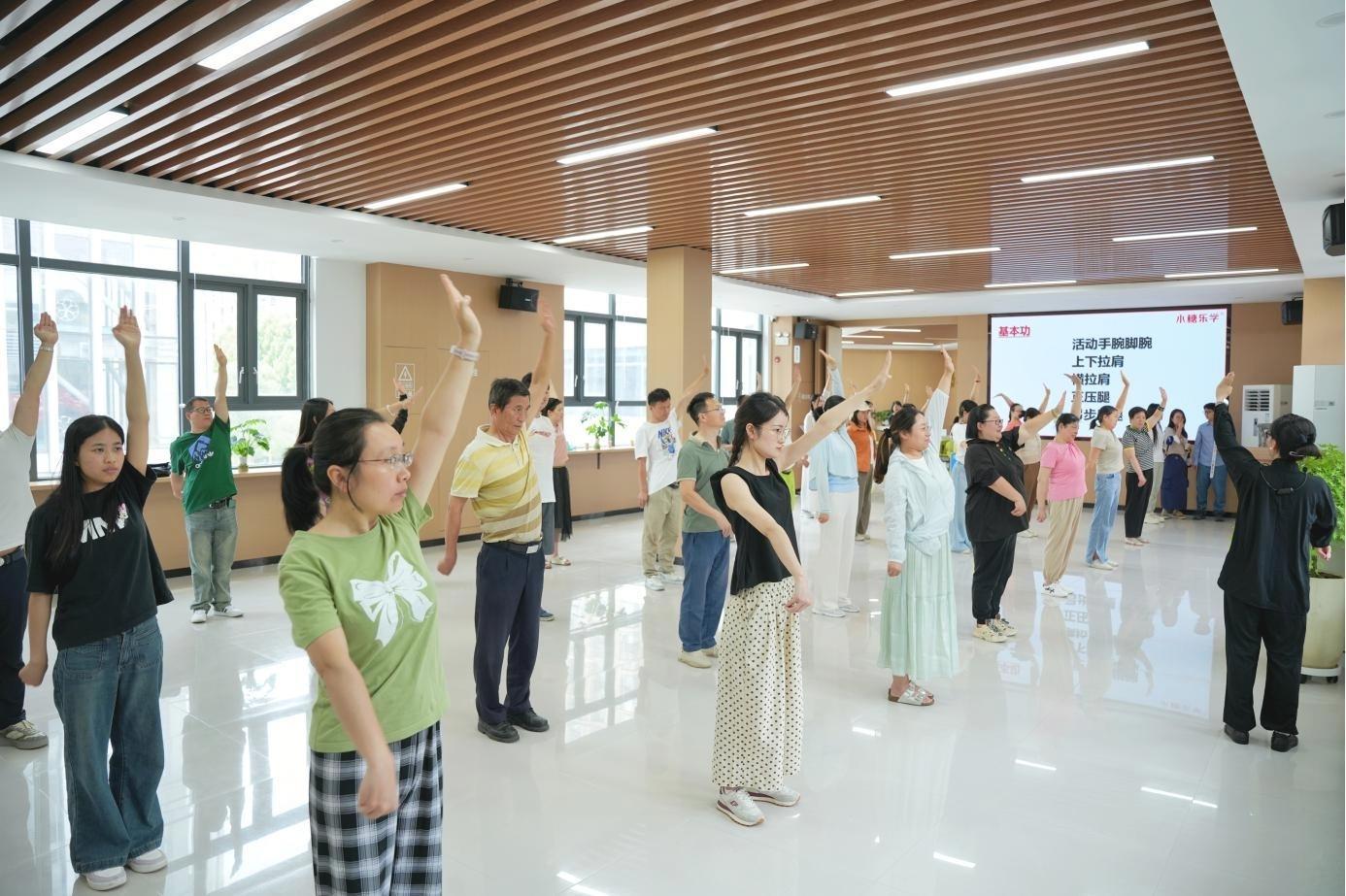 5月30日下午,武汉东湖高新区佛祖岭街道金融港社区党群服务中心内,一场主题为“共习太极之道,守护非遗之光”的非遗传习公开课拉开帷幕。活动由金融港社区联合辖区企业小糖乐学共同举办,辖区职工、居民相聚在这里,在太极拳的一招一式中感受传统文化与现代社区的共生活力。