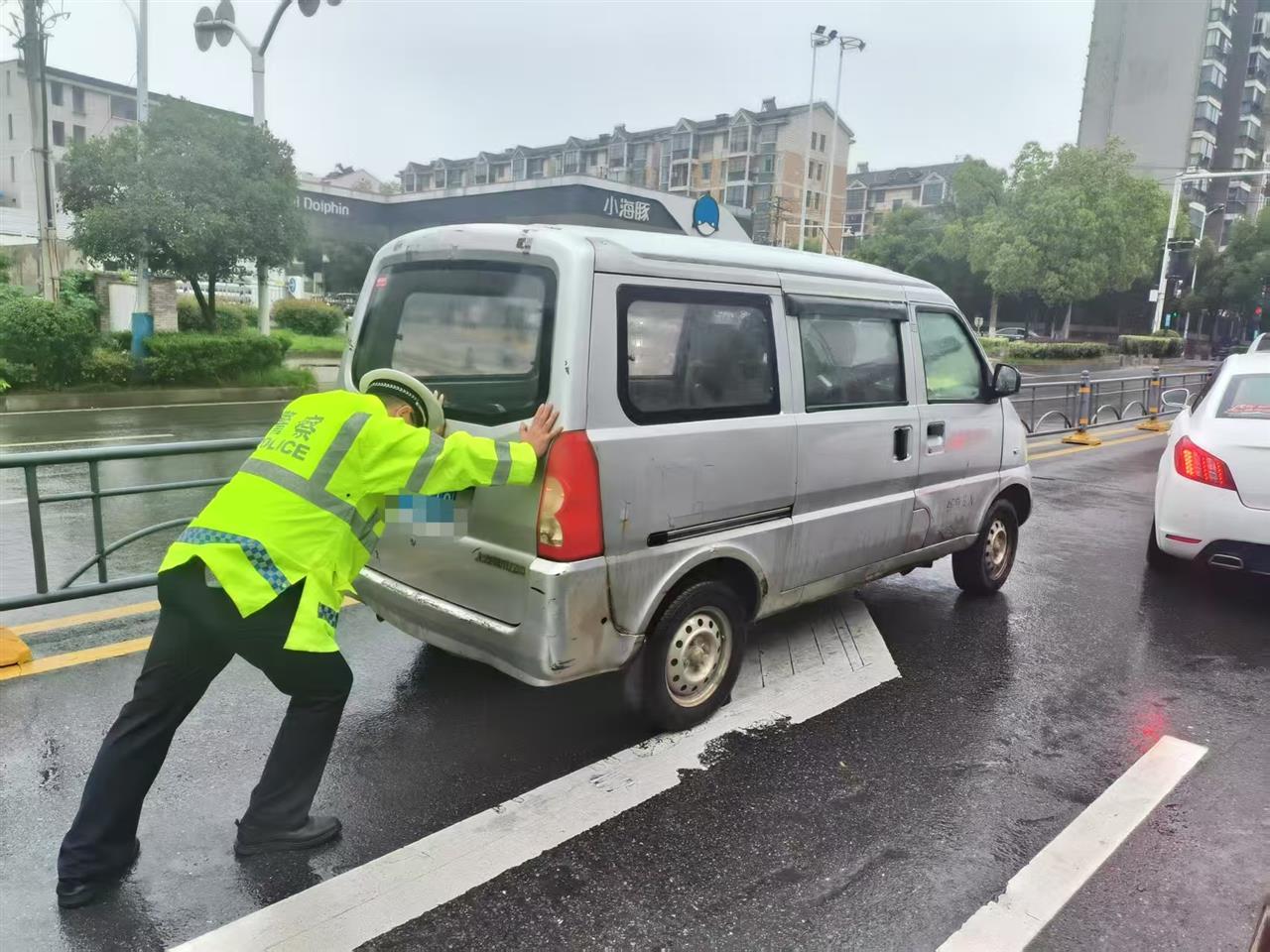 10时58分,雨势正猛,江夏大道十一万路口上坡路段,一辆面包车突发故障抛锚。受暴雨影响,湿滑路面加上车辆停滞,后方车流开始缓慢积压,对交通的影响越来越大。现场快骑队员敖鹏第一时间赶到,在做好安全警示后,主动上前帮助车主,冒雨合力将故障车辆推至中建龙城路口。短短几分钟,道路恢复畅通,车辆有序通行,车主连声道谢。