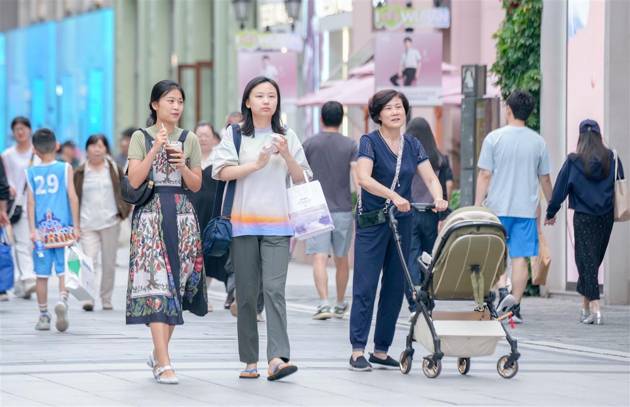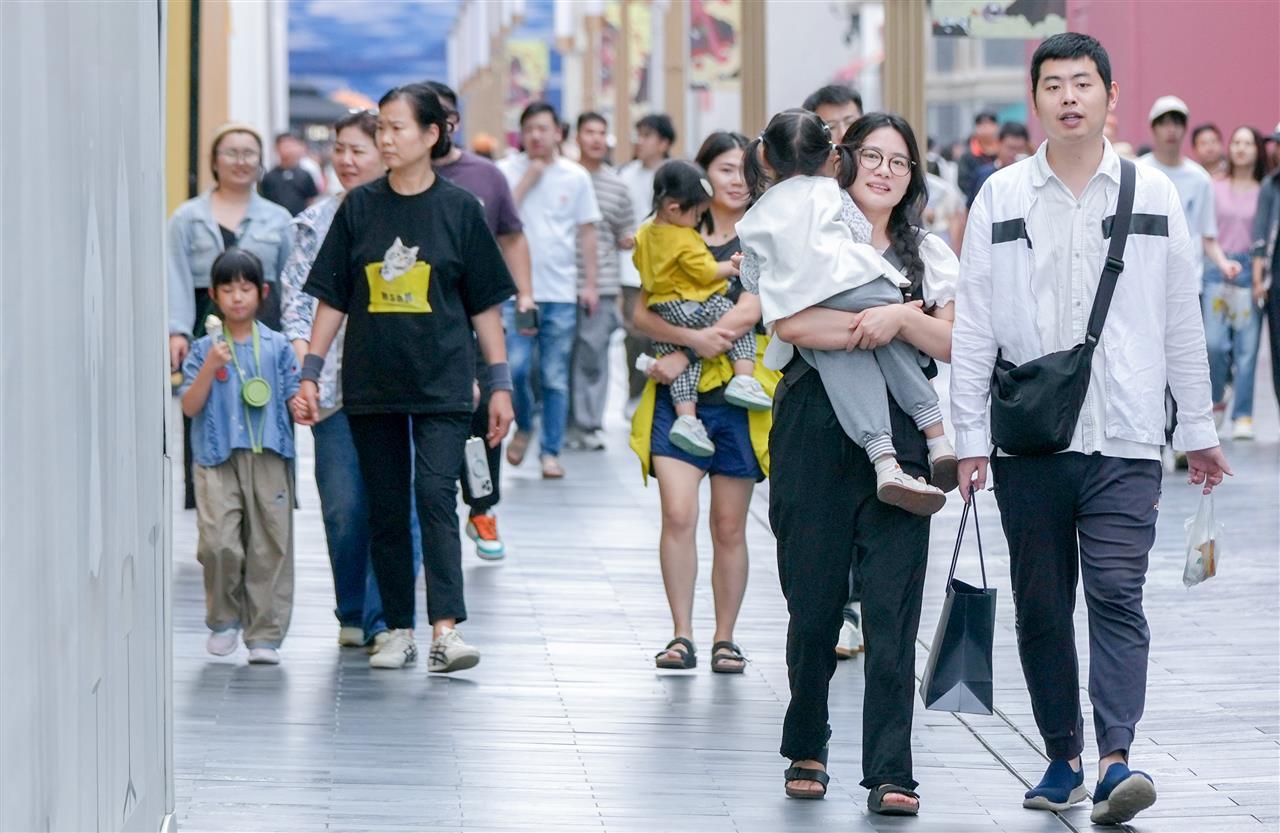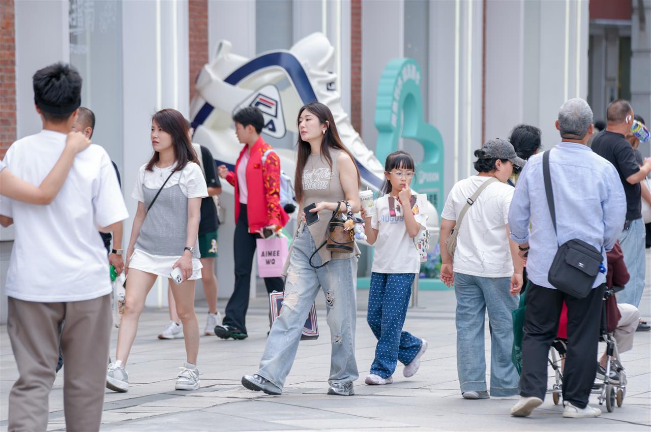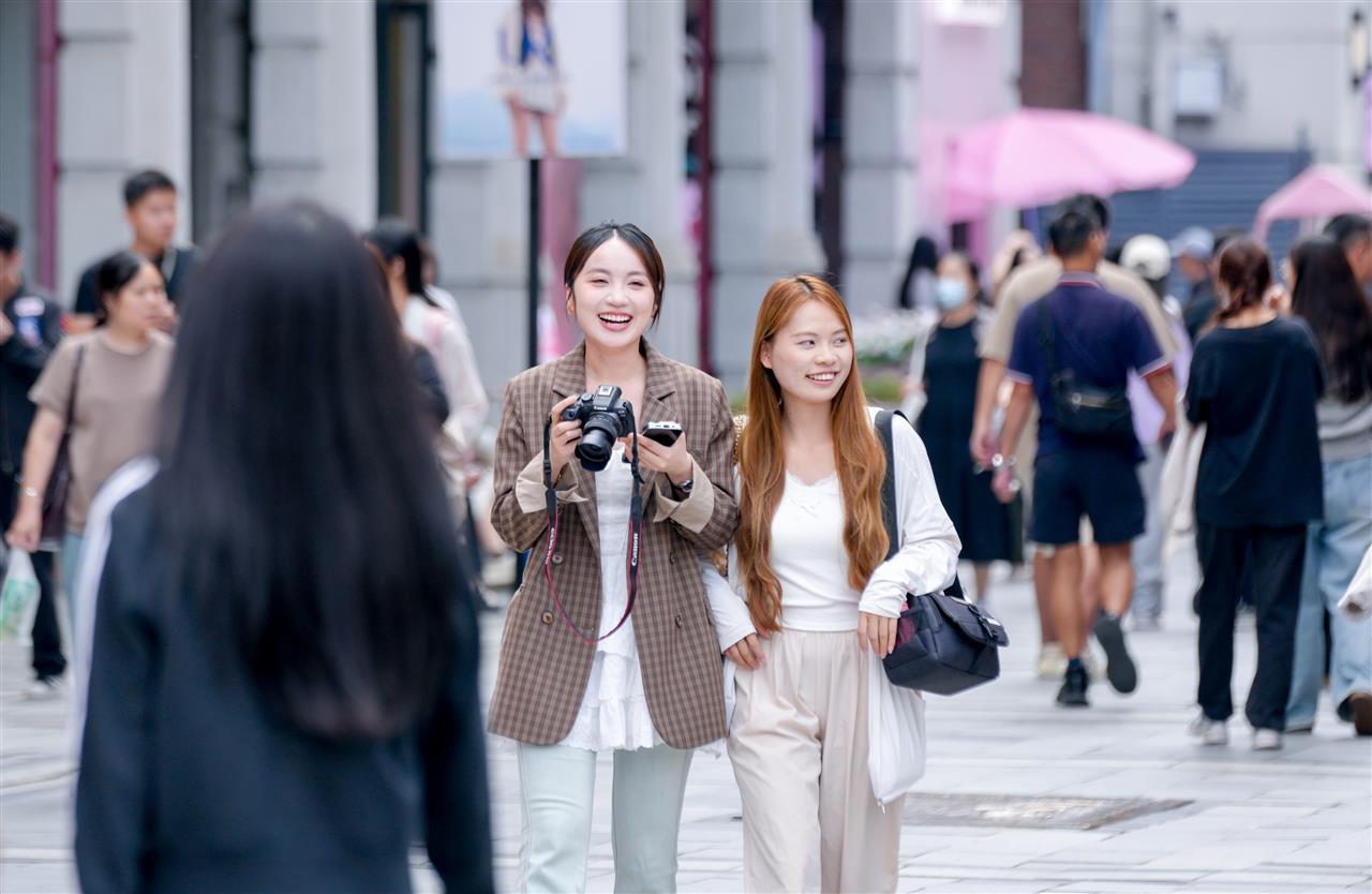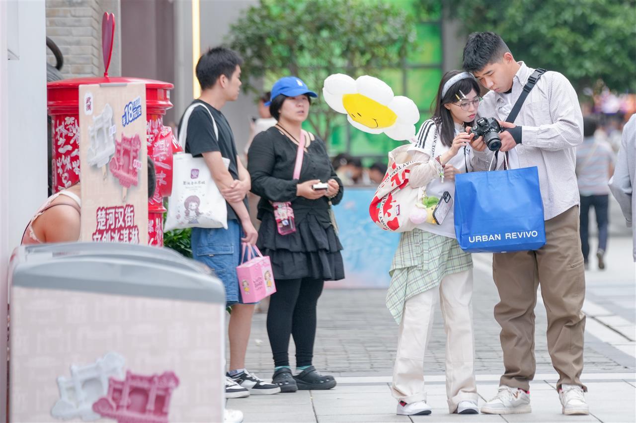 当天下午3时许,新闻记者现场看到,1500多米的街面上热闹非凡。步道上,不少家庭全员出动,大人带着孩子,悠然漫步于充满楚风汉韵的街道。街边店铺生意红火,特色小吃店、文创店及服装店内人头攒动。大家抓住假期的尾巴,尽情享受难得的好天气。