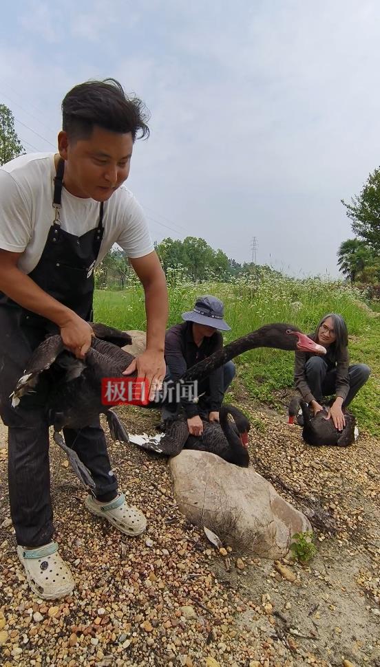6月3日上午,饲养员余亚洲和工作人员在湖边抓了两只英俊的公天鹅,带着它们跟母天鹅碰头。