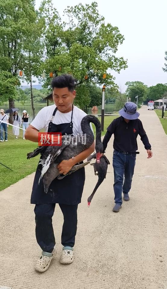 天外天工作人员介绍,黑天鹅的故事在网上走红之后,不少人慕名前来欣赏黑天鹅,有人怒斥公天鹅是“渣鹅”,有人抢着跟饲养员余亚洲合影。