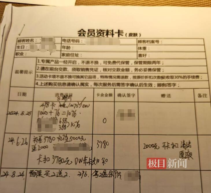 然而,杨女士当场反驳:“办卡时店员只让我签了姓名和电话,根本没提过手续费的事。”她质疑,资料卡上的条款格式合同条款涉嫌“霸王条款”,且闭店是商家单方面原因导致,不应由消费者承担损失。