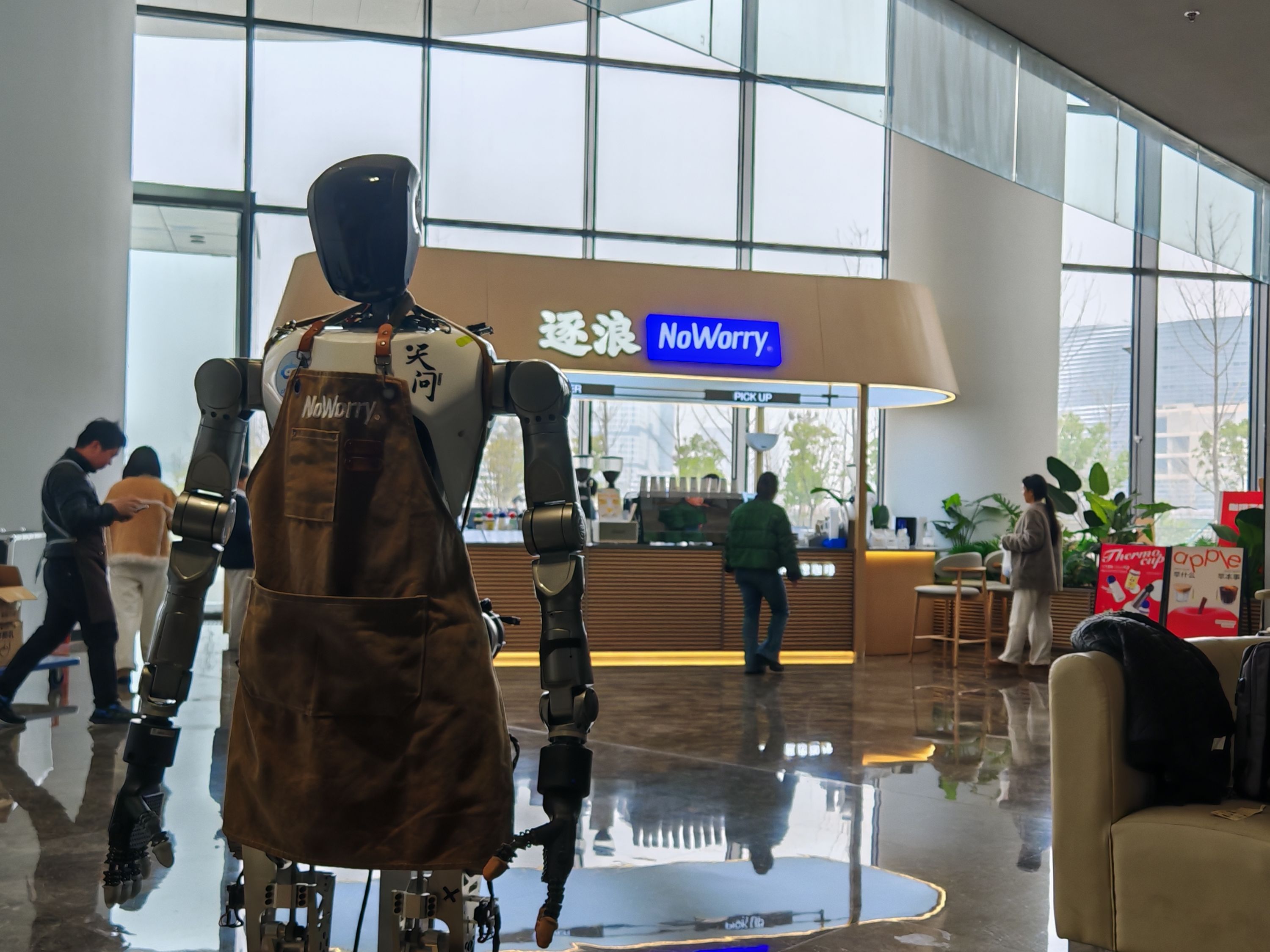武大人形机器人“天问”到咖啡店“实习”。学校供图