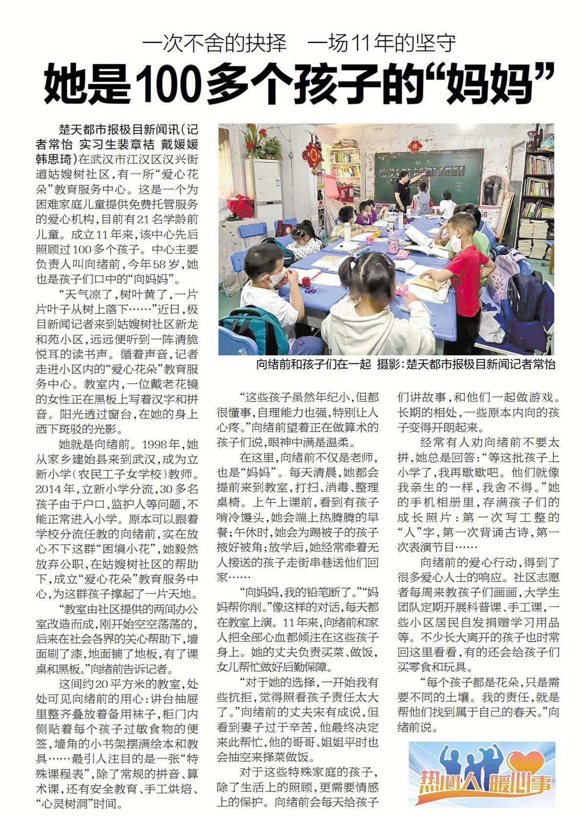 在武汉市江汉区汉兴街道姑嫂树社区,有一所“爱心花朵”教育服务中心。这是一个为困难家庭儿童提供免费托管服务的爱心机构,目前有21名学龄前儿童。成立11年来,该中心先后照顾过100多个孩子。中心主要负责人叫向绪前,今年58岁,她也是孩子们口中的“向妈妈”。