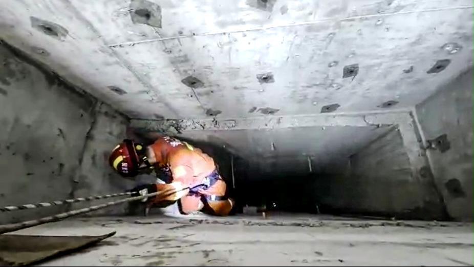 消防员到现场后发现,一名工人趴着被困在约8米深的通风井底部,通过询问得知,被困工人腰部受伤,无法行动。消防员们在井口设置了锚点,一名消防员绑好安全绳、携带救援设备下到井底。消防员安抚其情绪后,将他扶到担架上并进行固定。消防员观察井内情况发现,井的宽度约80厘米,且井壁内侧有大量突出的钢筋,井底还有少量积水,救援环境复杂且危险。