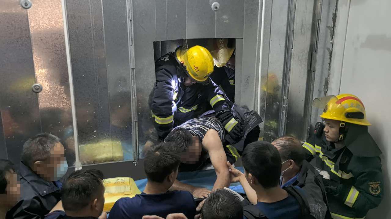 此时,消防员发现井底与一个金属通风管道相连,立即向其他消防员反映了这一情况。消防员们随即进入地下停车场,找到通风井与通风管道的连接处,使用破拆工具对通风管道进行切割,并进入通风井内,协力将被困工人安全抬出,移交给120医护人员送往医院救治。