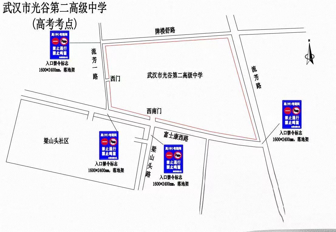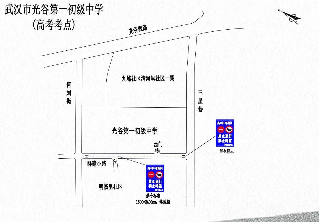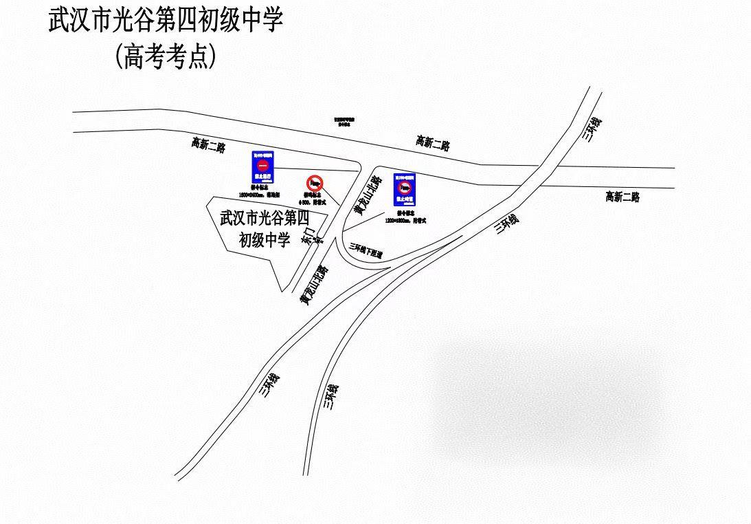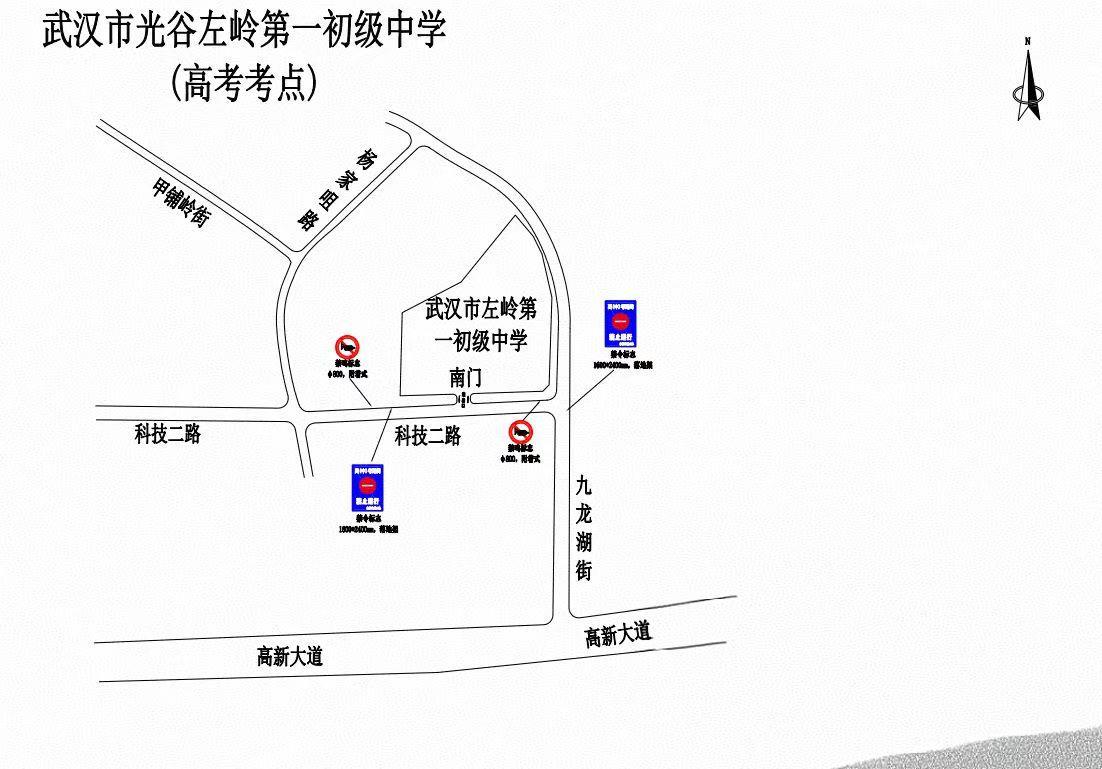 停车提示:接、送考车辆在学校门前上下客后可在光谷二路管制区域以外两侧单排顺向停放;