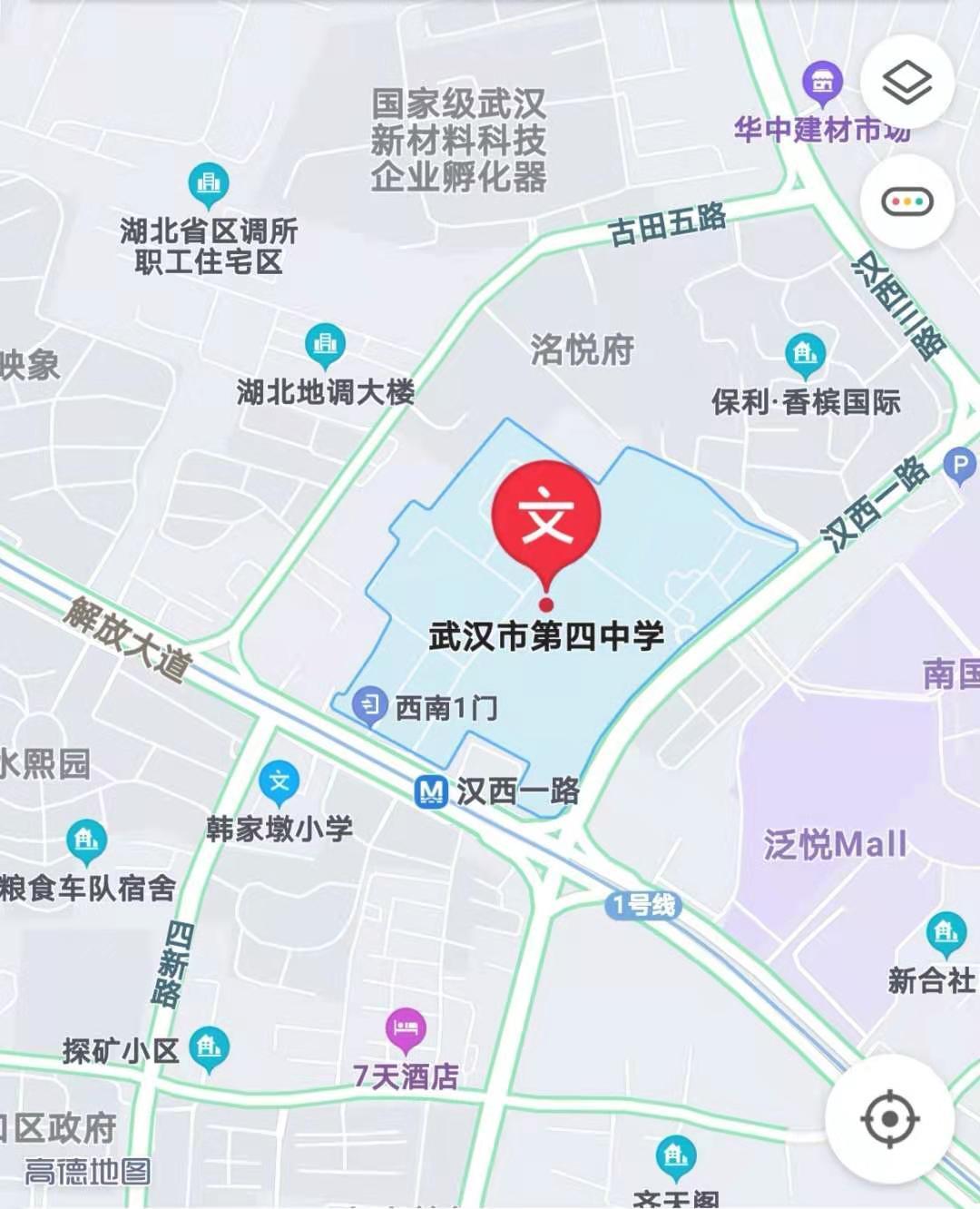 武汉市第四中学位于解放大道347号,处于解放大道与汉西一路交会处,解放大道大门前紧邻公交车站、轻轨站,交通便利,人流、车流量大,设置考场35个,考生1050名。