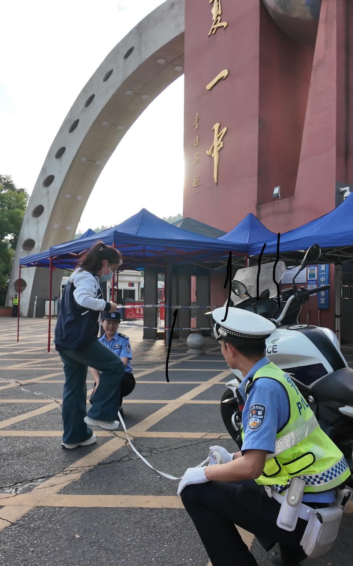 当天清晨6时30分许,武汉市江夏一中门口已热闹非凡。两位分别来自江夏分局交通大队的民警徐翔(警号038985)和治安大队的民警黄萌(警号039211)身着笔挺的警服,身姿挺拔地守候在校门口。他们在江夏一中门口拉起了一条“录取线”,执勤交警在旁边停放了一台车牌号为“鄂A9858”的铁骑,“左边211右边985,跨过这条线,愿望都实现!”每当有学生经过时,民警们用温暖而有力的声音向即将进入学校的学生们送上祝福。
