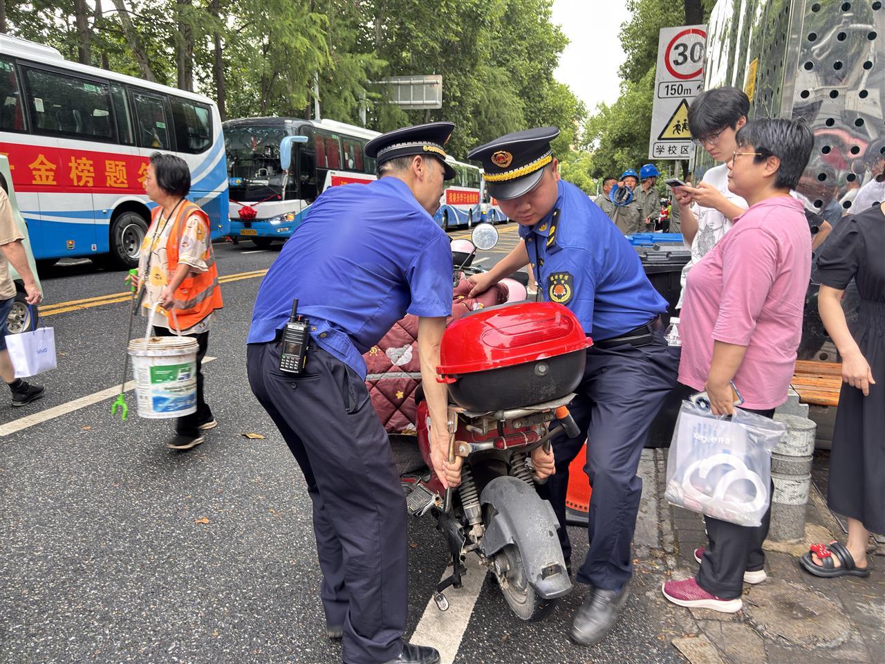 随着考生和家长陆续抵达,吴中路与山北路交会处的人行道上非机动车逐渐增多。为确保东西湖睿升学校、为明高中等学校的10余辆送考大巴顺利停靠,城管队员与交警分工协作:交警指挥机动车辆绕行五环大道,城管队员则引导非机动车规范停放。“黄威,搭把手!”见几辆电动车占用人行道不规范停放,执法队员王小军迅速招呼队员们将车辆抬至指定区域,腾出安全通道。