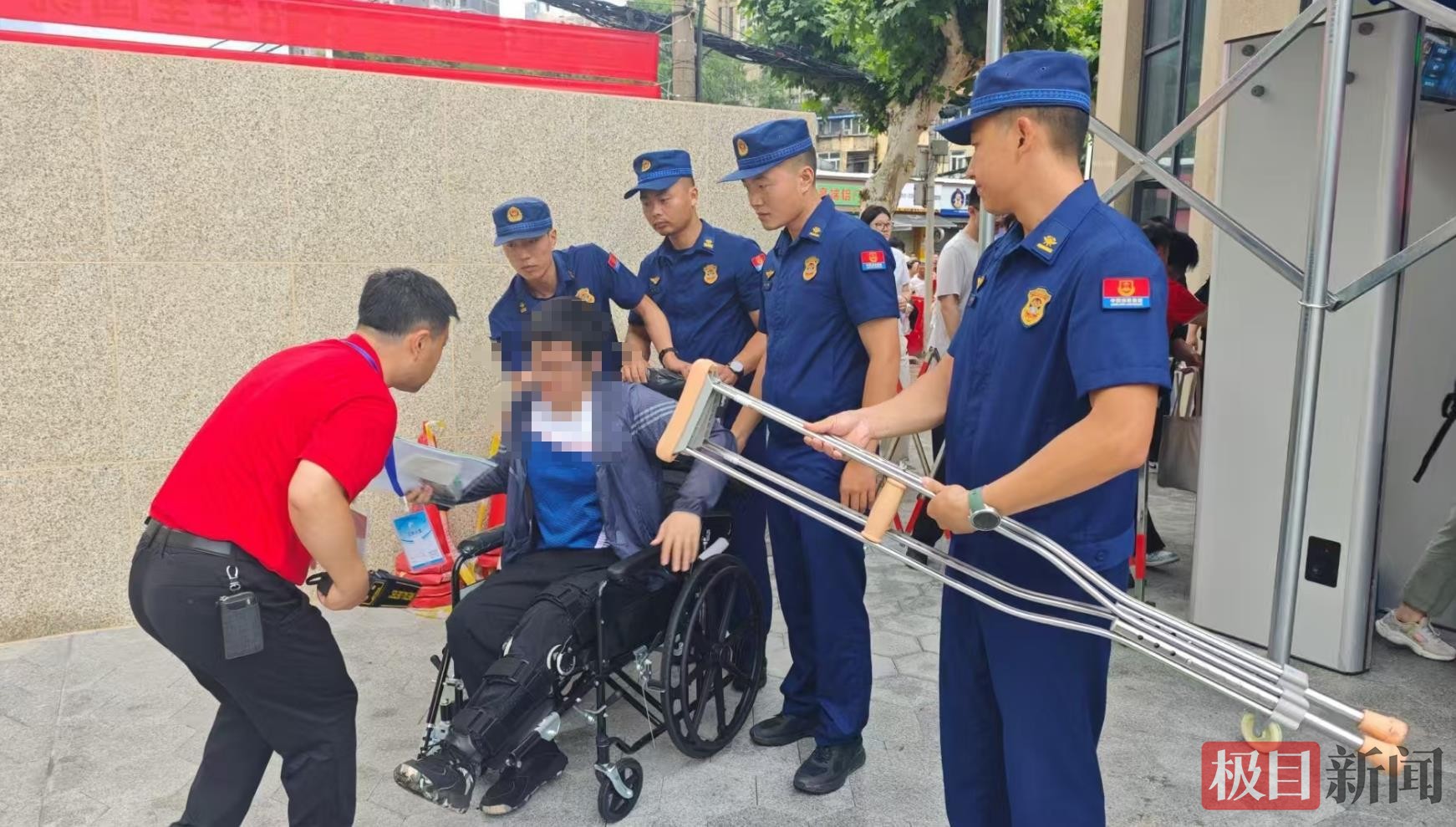 当天上午,在武汉市第十二中学考点外,一名坐着轮椅、行动不便的考生正在进入考点,由于家长不能进入考场,该考生在考点入口处停了下来。国家华中区域应急救援中心水域救援模块三大队队员立刻上前,帮忙提拐杖、拿文具、推轮椅,搀扶其通过安检通道。由于考场在楼上,一名消防员迅速蹲下,将这名考生背起来。最终,在应急救援人员的接力护送下,这位考生安全、顺利地被送达考场。