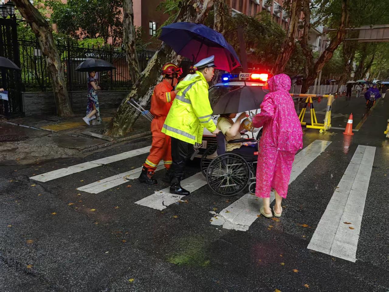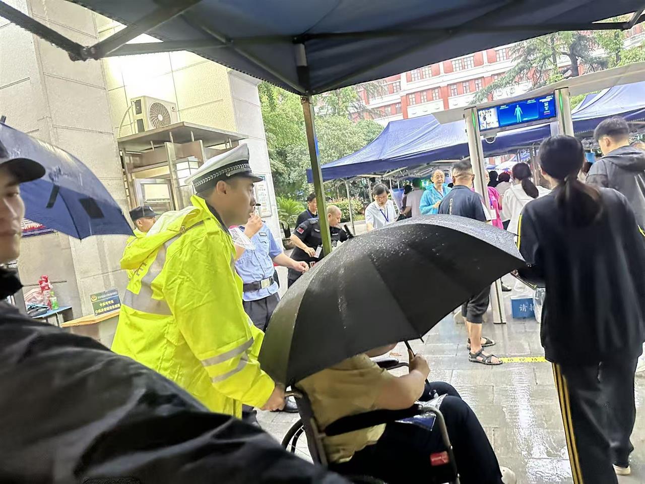 此时大雨还在不停地下。经此执勤的消防员晏贤军撑开了手中的大伞,并接过考生的拐杖,把考生送进考点。考点工作人员接过轮椅,把考生送进考场。