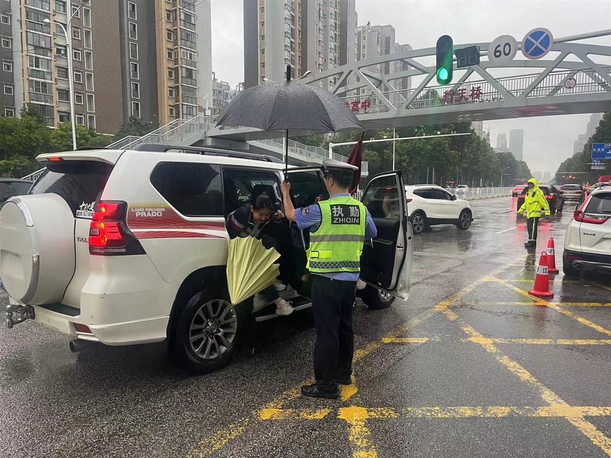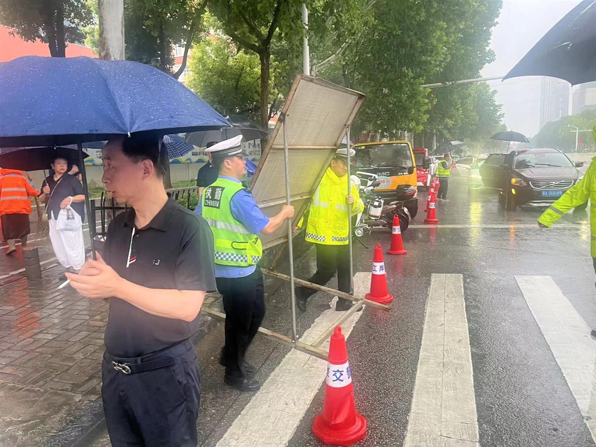 6月8日清晨,武汉的天空被厚重的雨幕笼罩,急促的雨点砸在武汉市汉铁高级中学考点外的路面上,溅起一片片水花。校门口,江岸公安早已就位,警服被雨水浸透,斑马线上,交警正冒雨合力将“禁止鸣笛”的交通标识警示牌搬到考点门前指定位置。