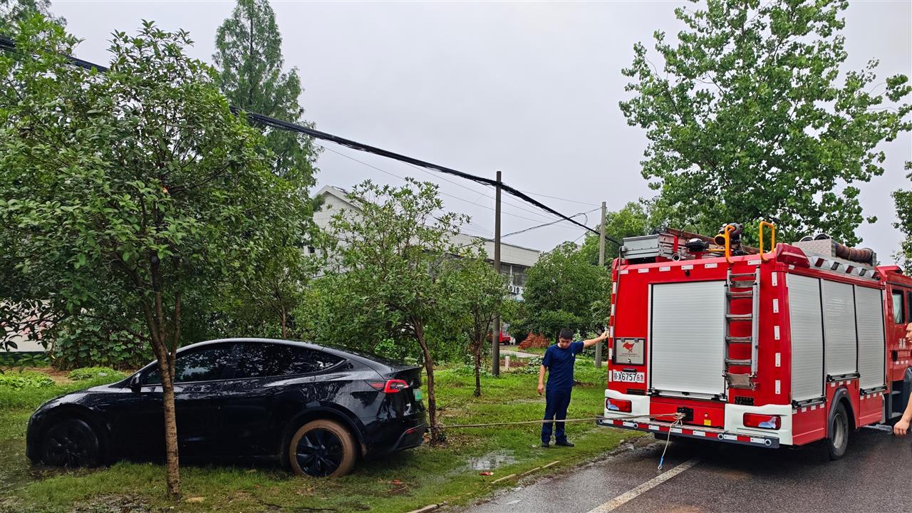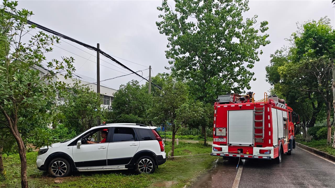 6月7日高考期间,武汉持续强降雨天气。当日12时45分,正在武汉新洲区城关高中执行执勤任务的永安大道消防救援站汪集小型站,接到两名女老师求助:因连日暴雨,她们停放在考场附近的两辆小汽车陷入泥地,无法脱困。