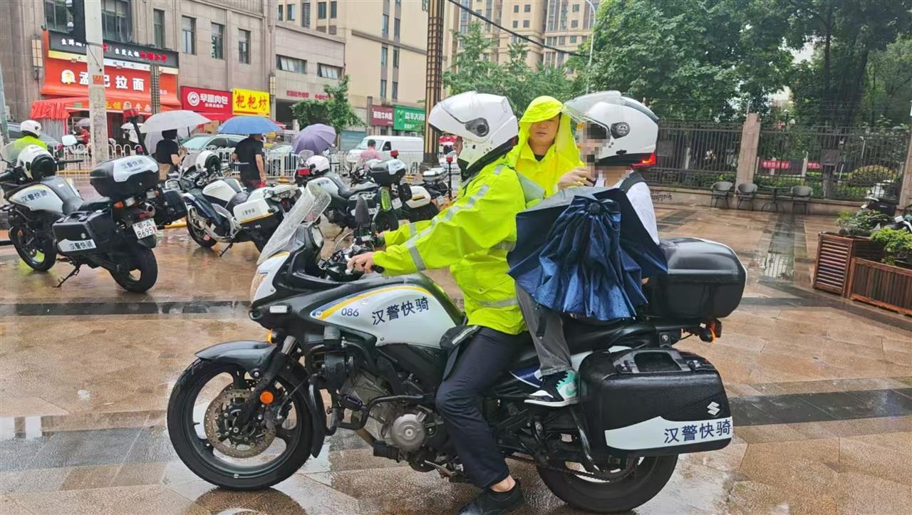6月8日14时13分,武汉市洪山区交管大队民警付铭鑫正在熊家嘴路段冒雨疏导交通,一名考生焦急地上前求助,称自己要去关山中学参加考试,因下雨打不到车,希望交警给予帮助。接到求助后,付铭鑫立即安排快骑队员余江前往护送。