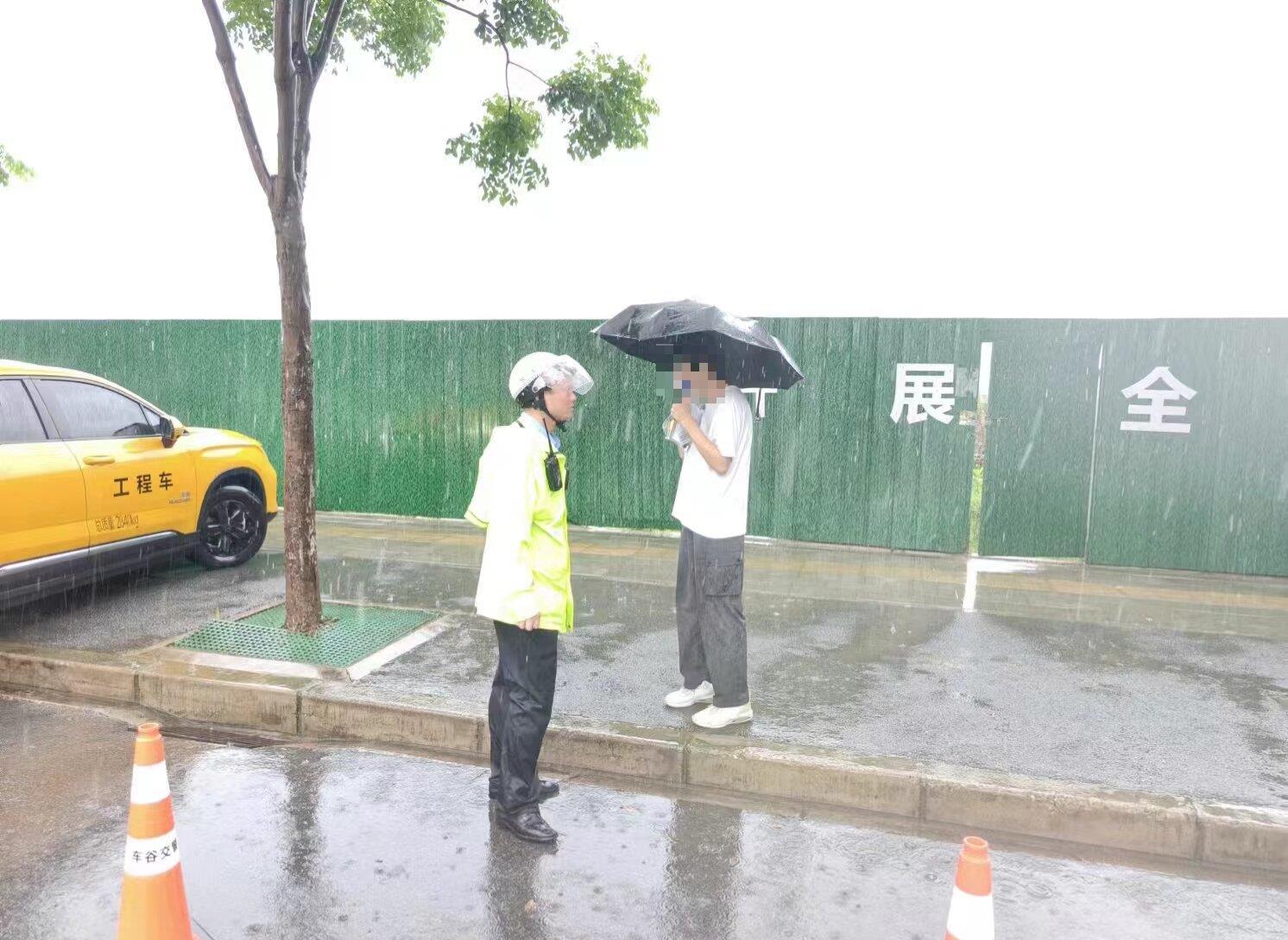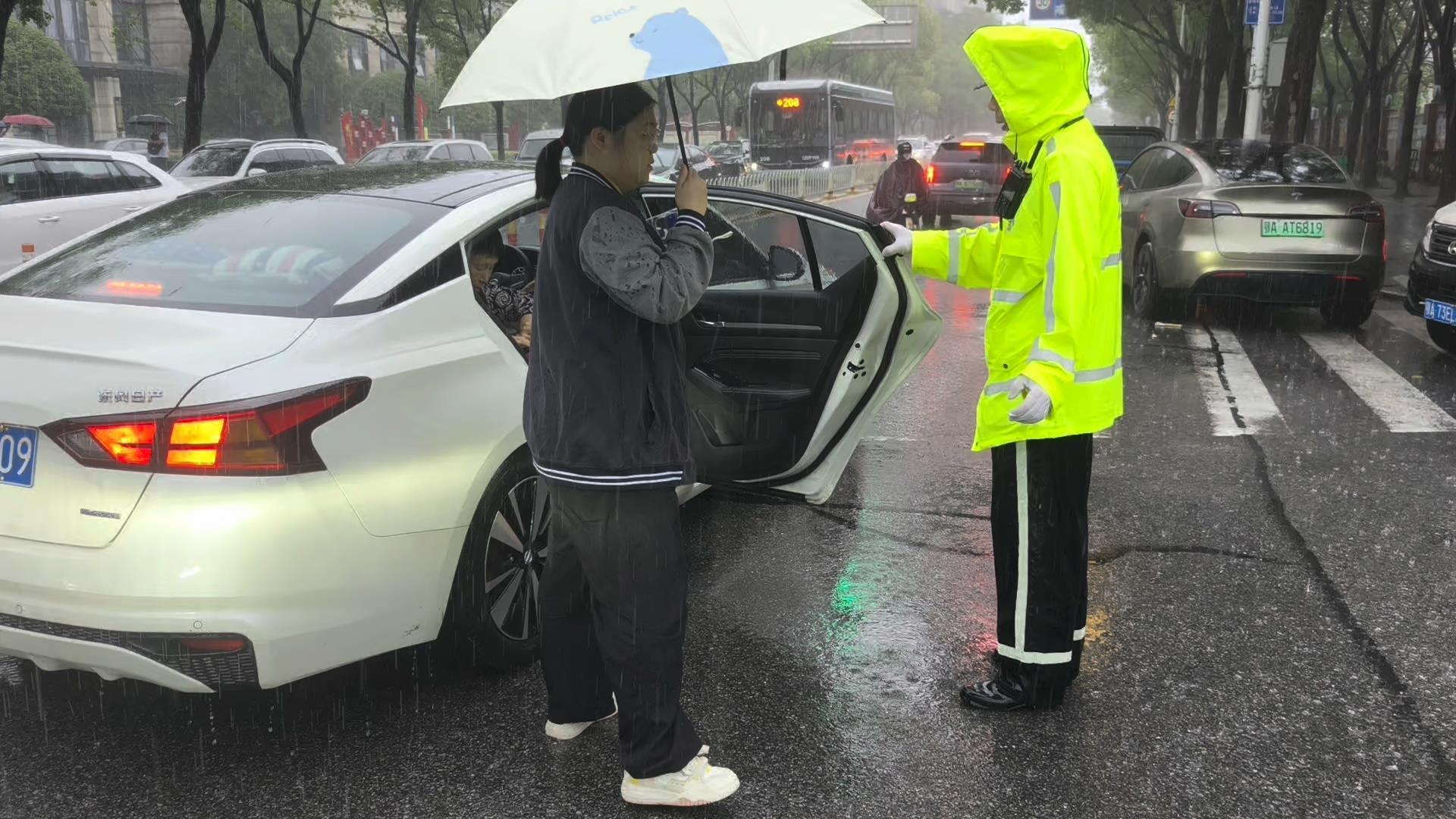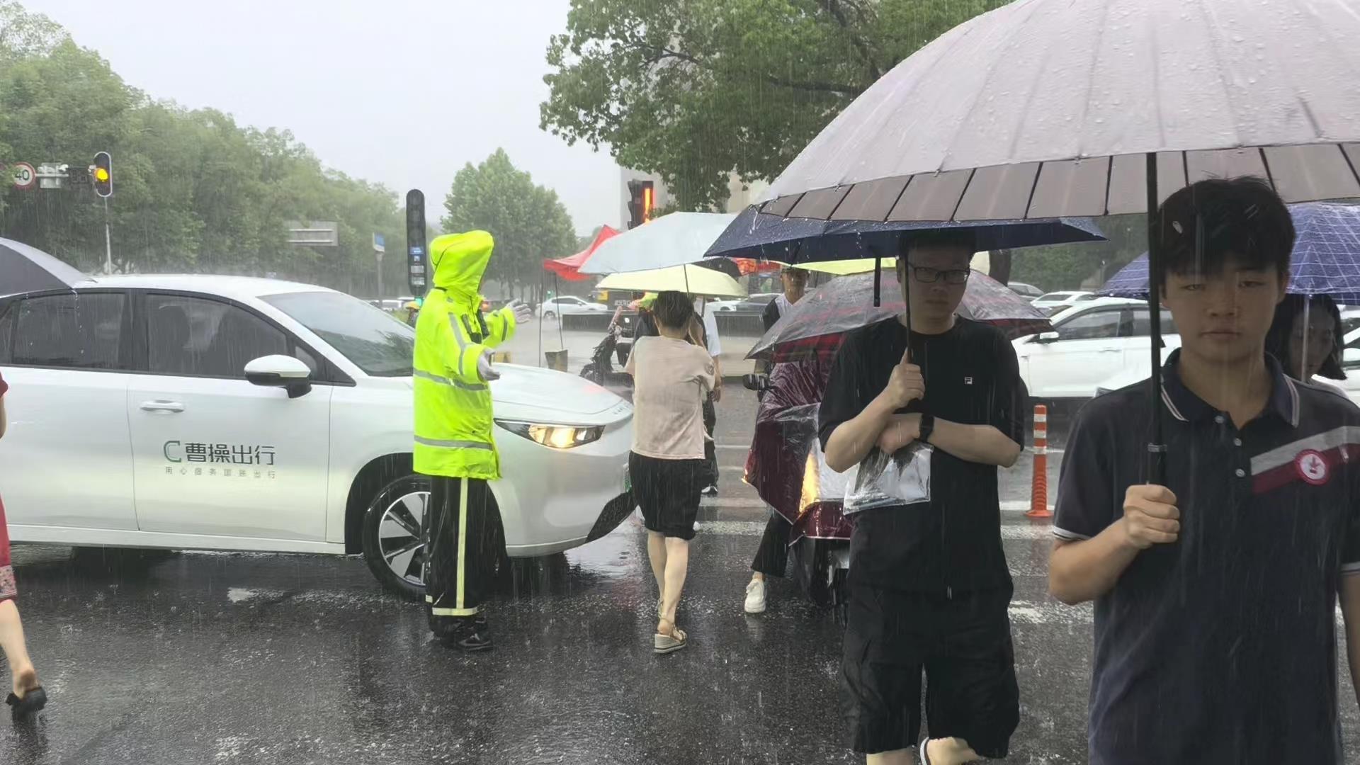 6月8日清晨7时30分,高考第二天突降大雨。在经开一高考点外的三角湖路博学路路口,考生们冒雨赶考。武汉经开区交通管理大队民警辅警冒雨疏导交通,指挥车辆礼让行人,护送考生安全过马路。一中队辅警吴刚在送考车旁细心叮嘱每位考生:“下雨天,拿好考试用品。”考生们纷纷道谢,一句句“你好”温暖人心。民警姚明坚守岗位,尽管全身湿透,仍专注守护考生有序入场。