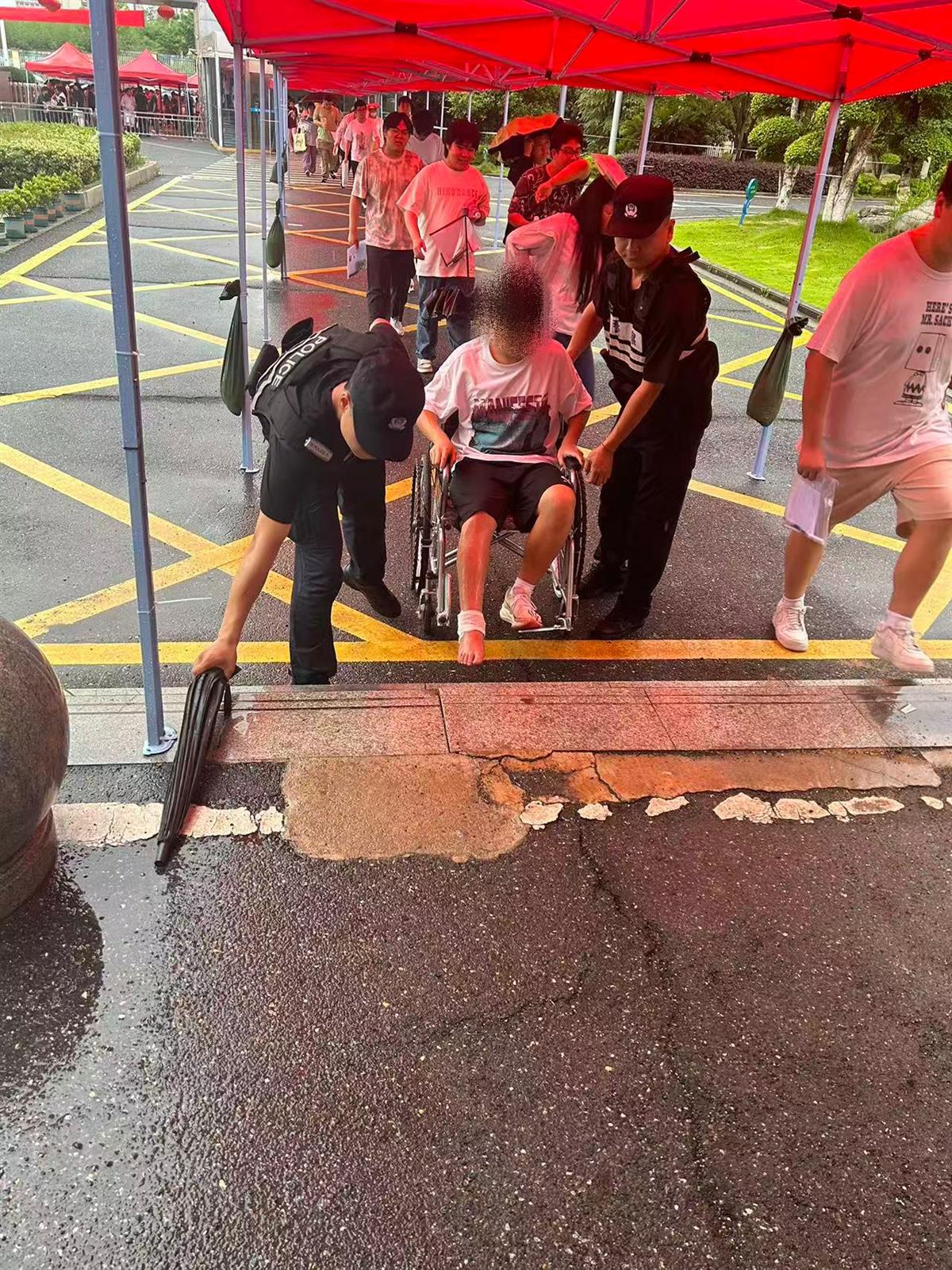 6月7日高考首日上午,在江夏区职业中学考点执勤的郑店公安检查站教导员高珍贵,敏锐地注意到人群中一名坐着轮椅、由家长推行的考生。经上前询问得知,该考生在高考前夕不慎腿部骨折,行动极为不便,而考场却设在教学楼三楼。