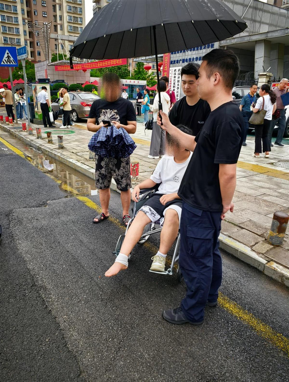 高考期间,武汉市江夏区上演暖心一幕:一名因考前踢球意外导致腿部骨折的考生,在郑店公安检查站民辅警连续三天的护送下,顺利参加人生大考。