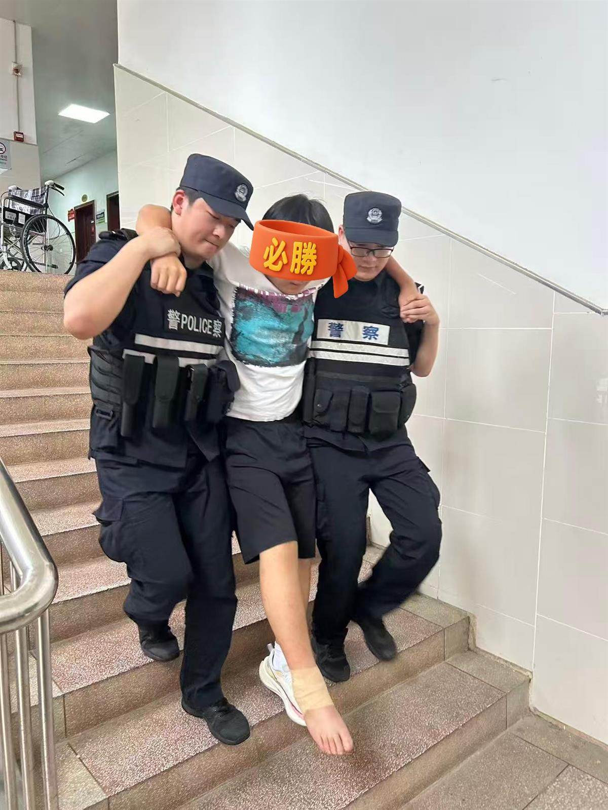 面对这一特殊情况,执勤民辅警没有丝毫犹豫。教导员高珍贵和同事们立即俯下身,一左一右稳稳架起考生双臂,用坚实的臂膀承担起他的重量,小心翼翼地护送他一步步登上三楼,安全准时抵达考场。