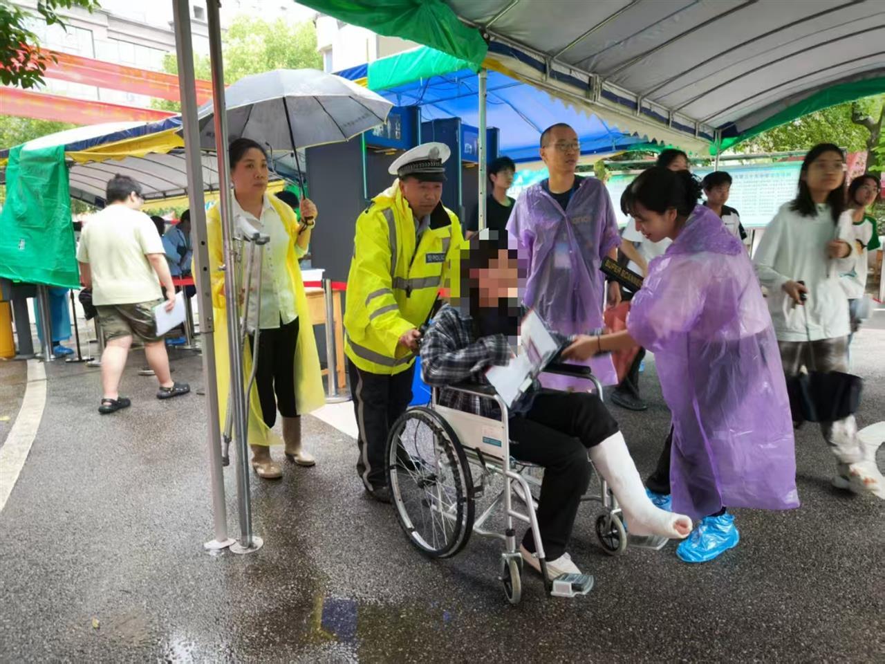 为保障特殊考生快速入校考试,又不影响其他考生,考点执勤交警、考点工作人员、家长相互约定时间,在考生到达前,工作人员提前将学校准备的轮椅放在校门口,再由交警、工作人员帮助考生走快速通道入校。