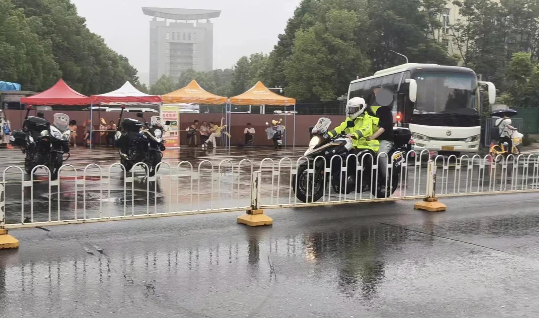 交警在暴雨中指挥引导送考车辆